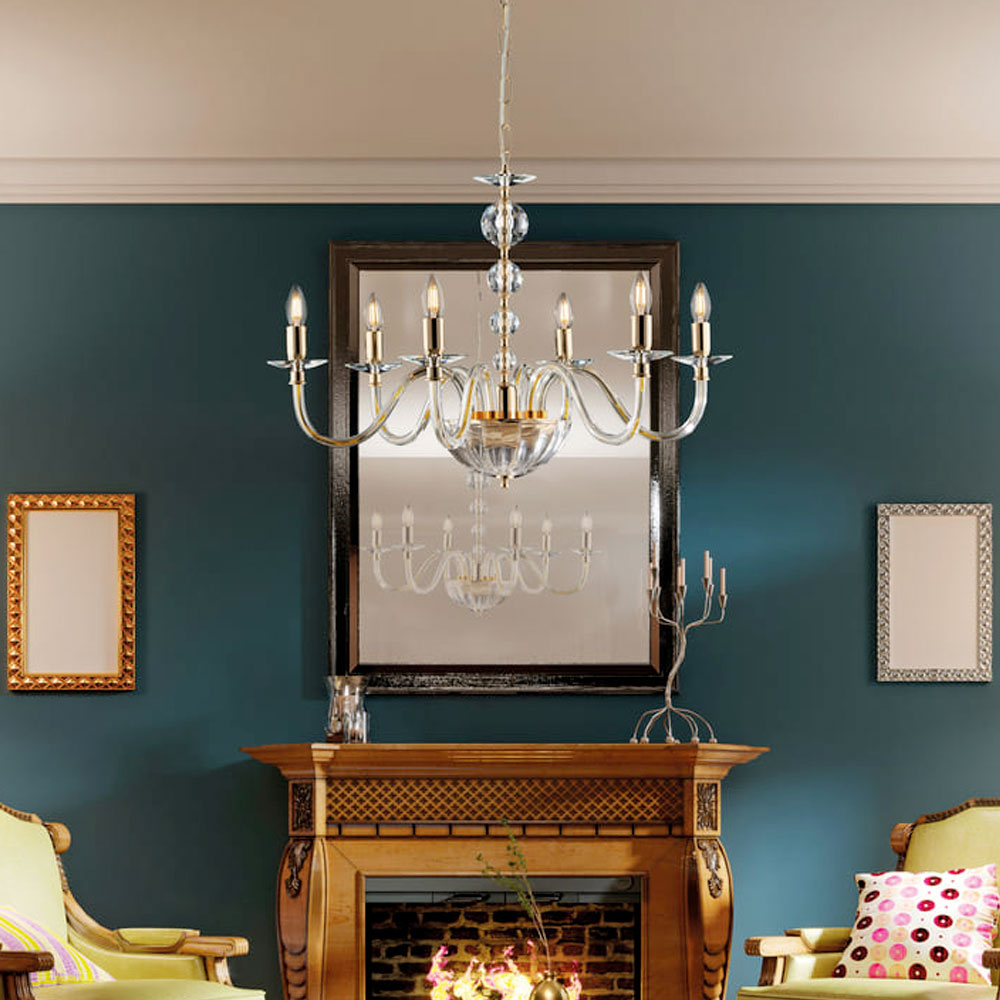 Denna klassiska lyxiga guldkrona med klart glas och strass är elegant och tidlös, en förfinad skapelse som tolkar den italienska dekorativa traditionen med dyrbar och lysande smak. Den harmoniska strukturen i polerat guld , utsmyckad med klara kristallelement och strassdetaljer, sprider ljuset med briljans och balans, vilket skapar en varm och dramatisk atmosfär.