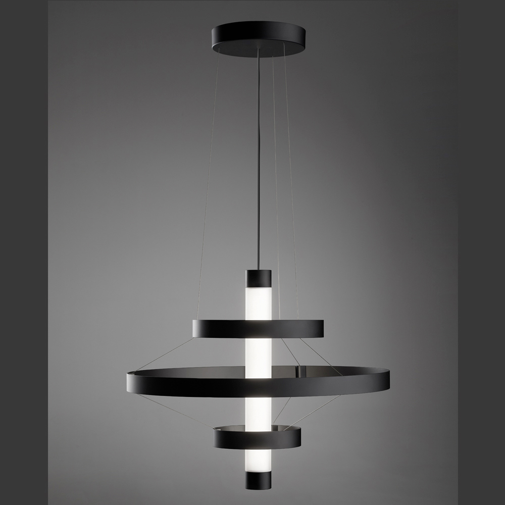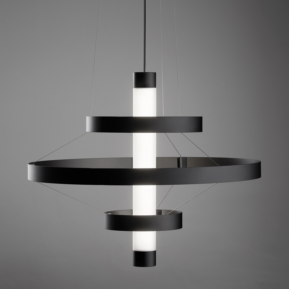 Denna pendellampa är en sann protagonist i alla utrymmen: en lysande skulptur som fångar ögat och ger personlighet och prestige åt miljön. Strukturen består av en serie koncentriska aluminiumringar , harmoniskt arrangerade runt den centrala kroppen, vilket skapar en dynamisk, elegant och tredimensionell visuell effekt.