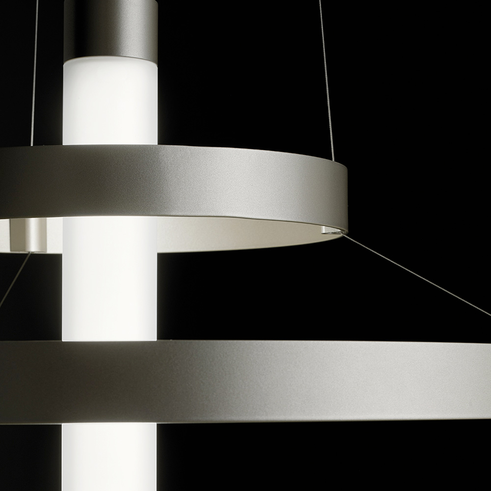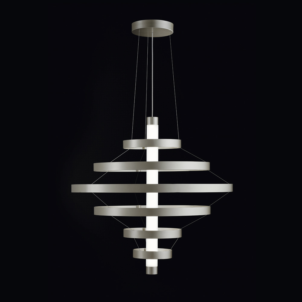 Inomhuskrona tillverkad med en central glaskropp, ljusets och energins stödpunkt, runt vilken är anordnade en serie ringar i olika storlekar som ser ut att vara upphängda i rymden i aluminium.