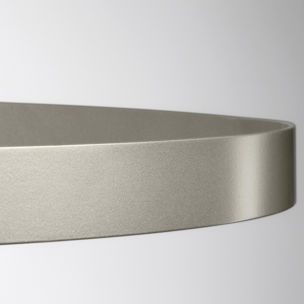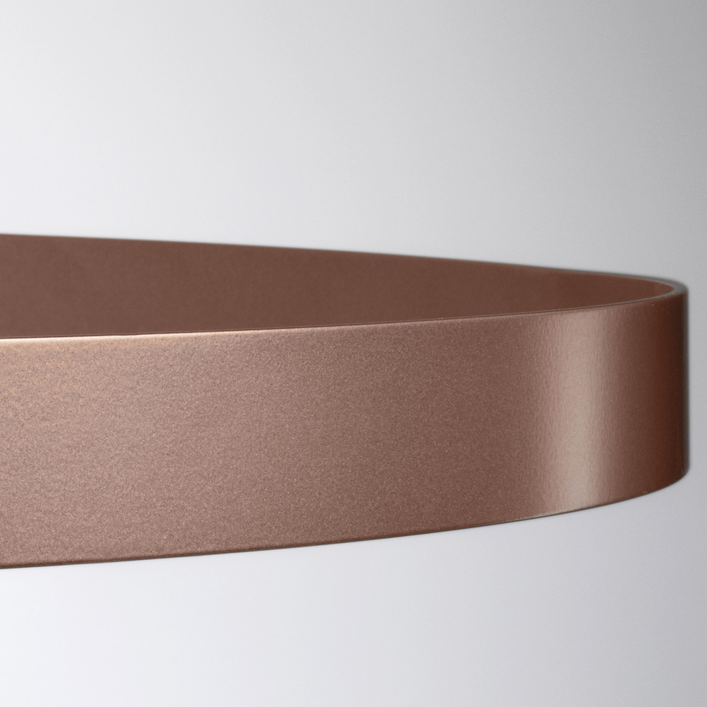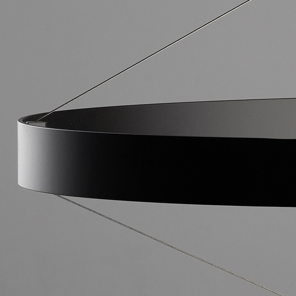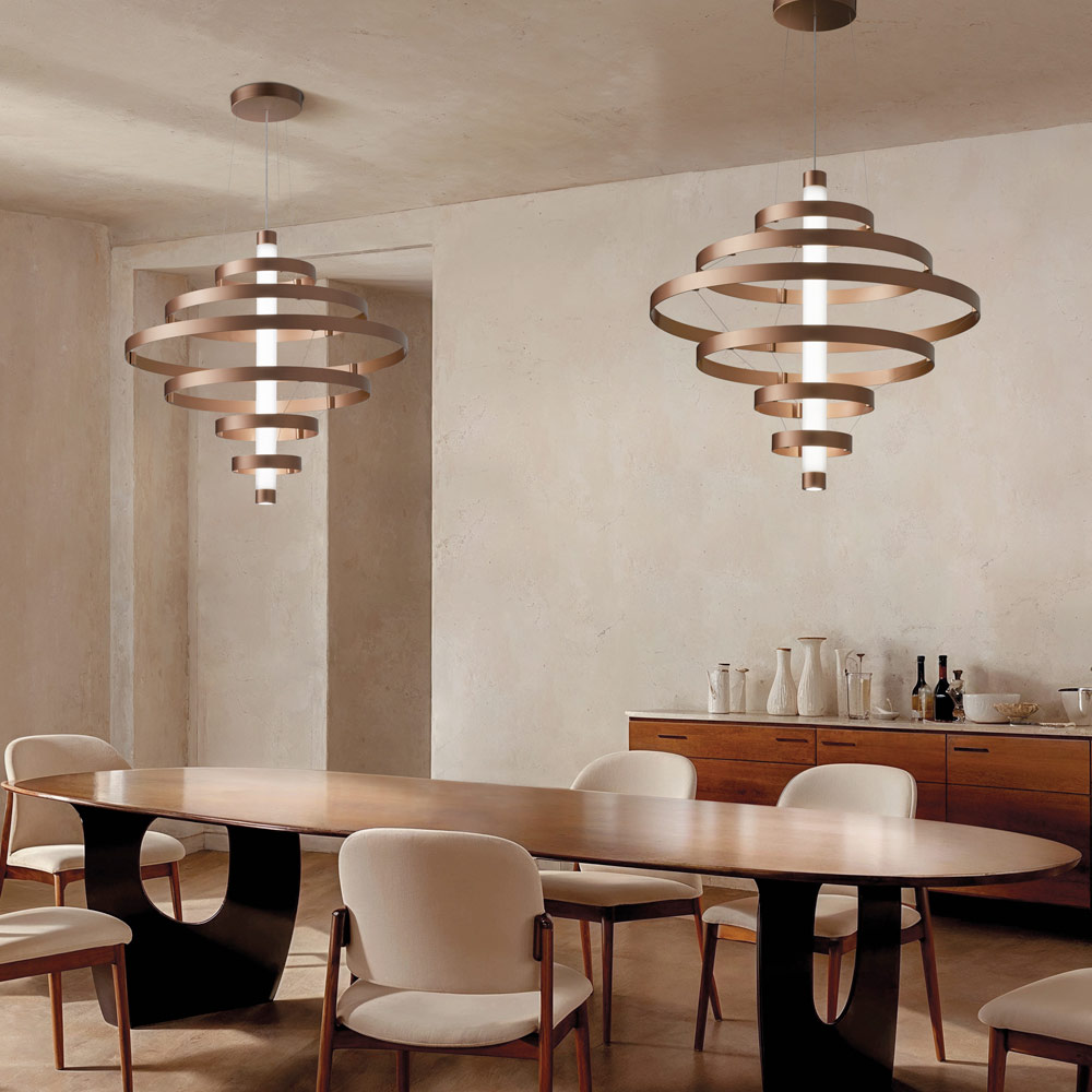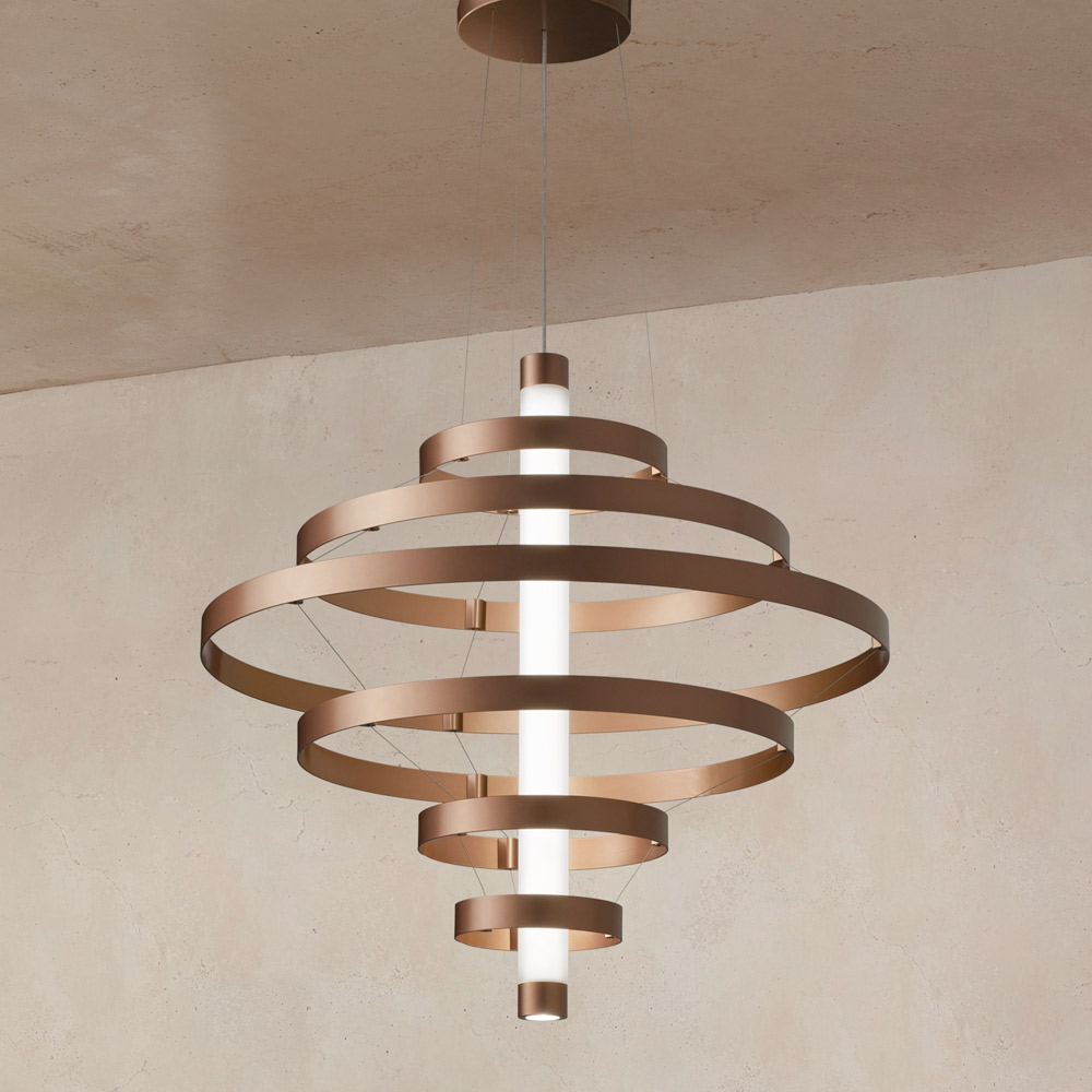 Denna pendellampa är en sann protagonist i alla utrymmen: en lysande skulptur som fångar ögat och ger personlighet och prestige åt miljön. Strukturen består av en serie koncentriska aluminiumringar , harmoniskt arrangerade runt den centrala kroppen, vilket skapar en dynamisk, elegant och tredimensionell visuell effekt.