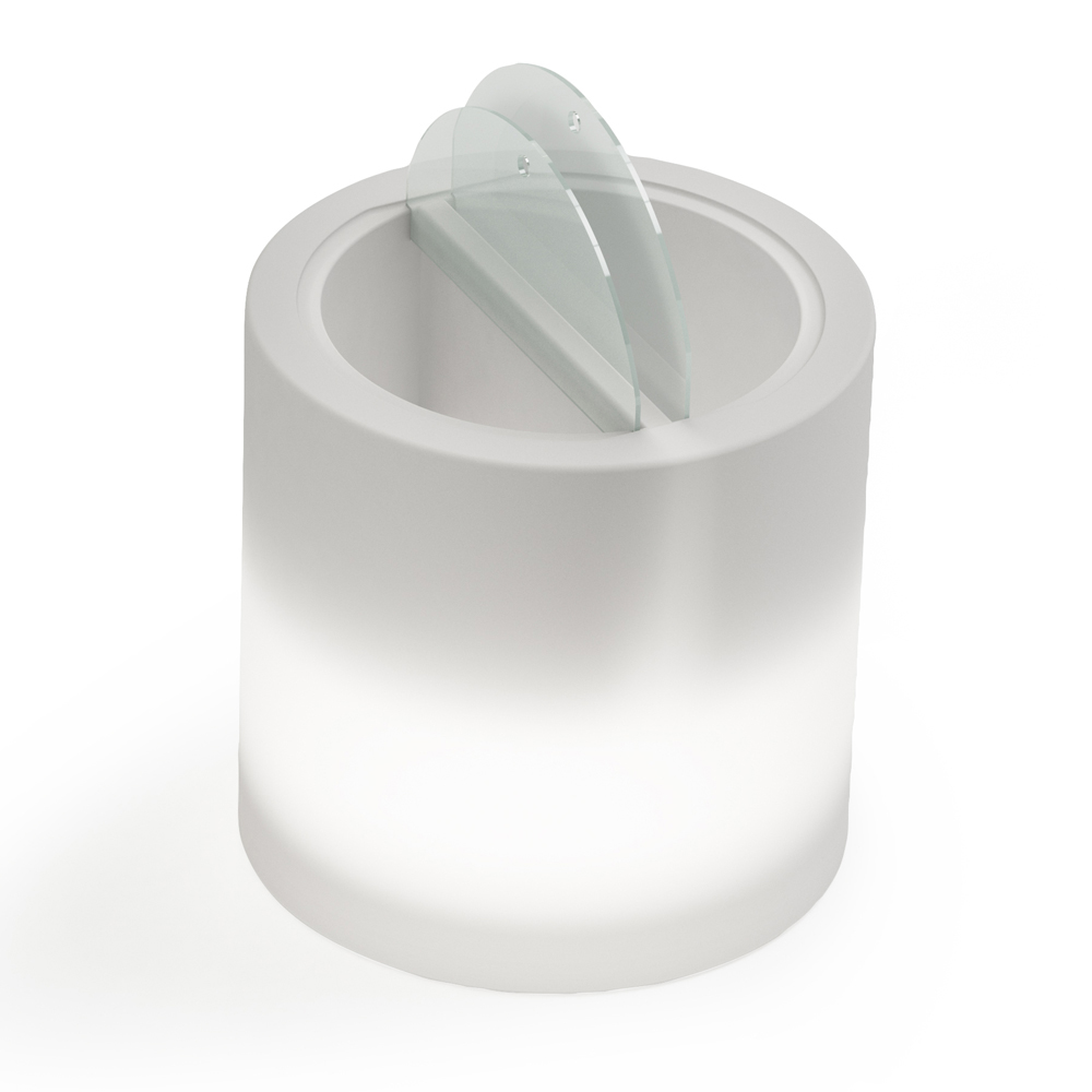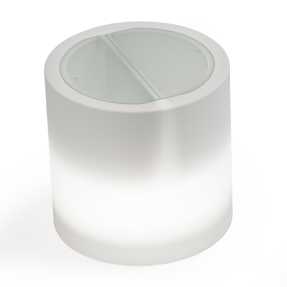 Detta trädgårdsbord helt bearbetat och tillverkat i Italien i polyeten med vitt ljus är utrustat med en behållare uppdelad i två fack med lock i plexiglas . Dessa två fack har lite olika storlekar så att de kan användas för olika ändamål, allt från att lagra mat och dryck till att använda is. I det senare fallet är den mindre brickan utrustad med en sats för att tömma överflödigt vatten för att bibehålla färskheten.