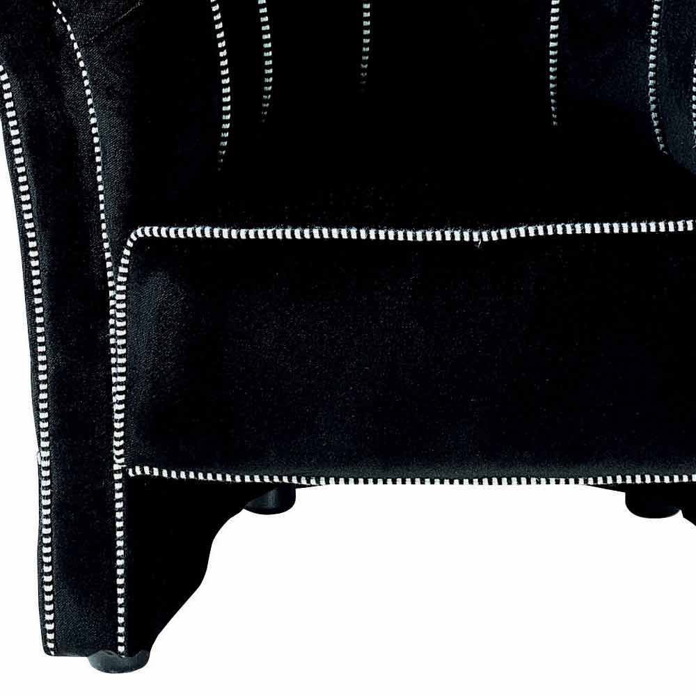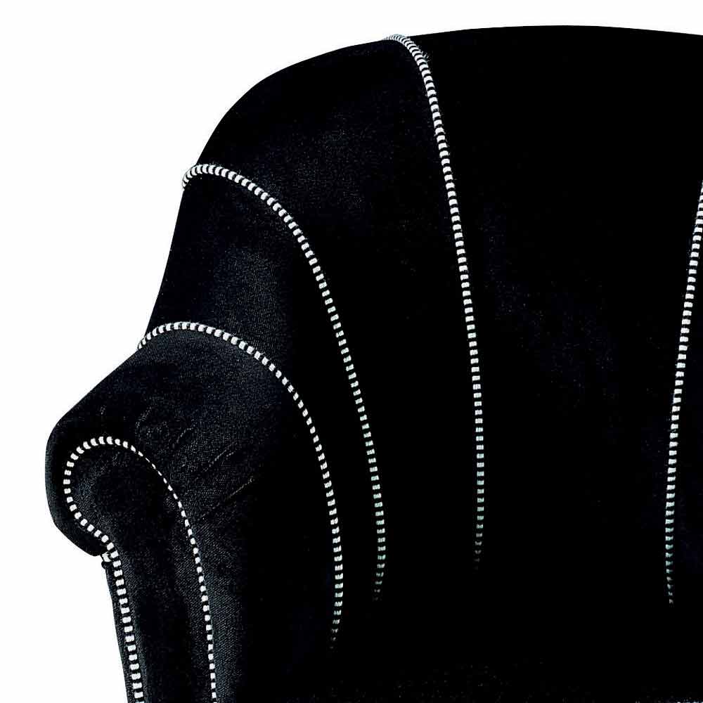 Vardagsrumsfåtölj med invändig träkonstruktion täckt av polyuretanskum och foder av polyesterfiber, ytterbeklädnad i svart sammet med svartvitt pynt ( ej avtagbar ). Denna fåtölj är tillverkad till 100% tillverkad i Italien och har en särskilt enkel och mångsidig form som enkelt anpassar sig till alla moderna vardagsrum tack vare en sober design och viktiga former . För att berika estetiken är de kontrasterande sömmarna som understryker fåtöljens grundläggande egenskaper, vilket ger en känsla av förfining och innovation för ett banbrytande resultat. Idealisk för dem som älskar en elegant inredningsstil, denna möbleringslösning har också ett sammetskydd, ett material som maximerar sin komfort även vid beröring. De material som valts och används för att förverkliga detta komplement gör det också möjligt att få ett särskilt välkomnande säte, därför perfekt för att spendera underbara stunder för avkoppling i ditt vardagsrum.