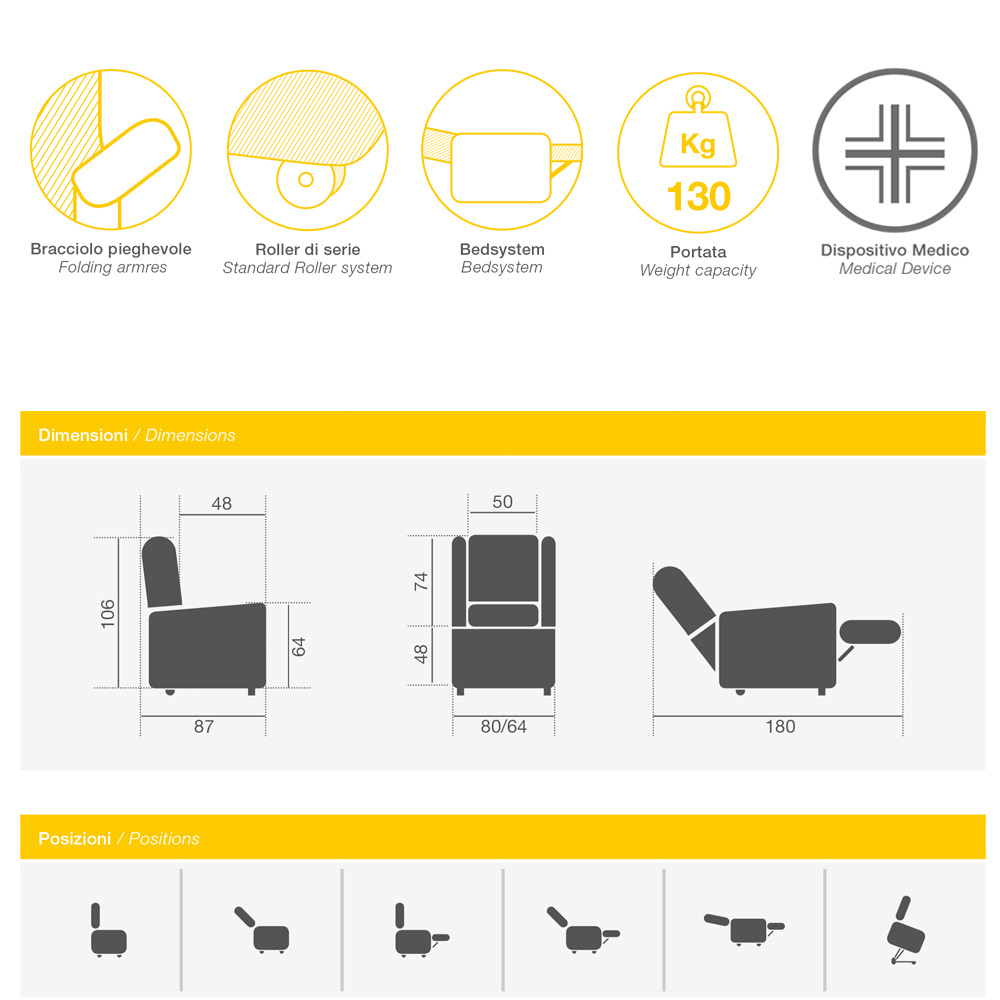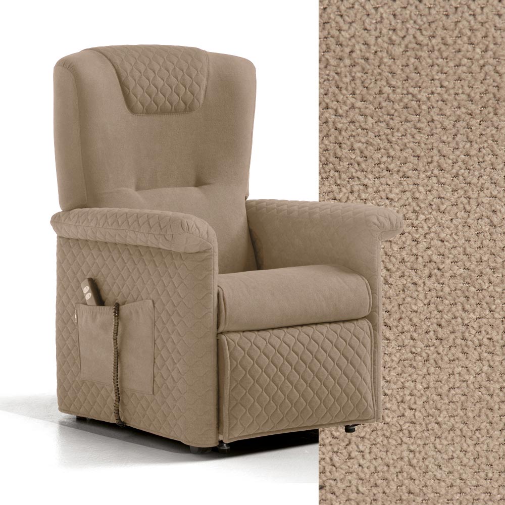 Fåtölj tillverkad med järn- och trästruktur , stoppning i icke-deformerbart polyuretanskum med differentierad densitet, 2-motors mekanik med Lift/Relax/Säng-funktioner och kvalitetstyg med hög slitstyrka och rullning som standard.