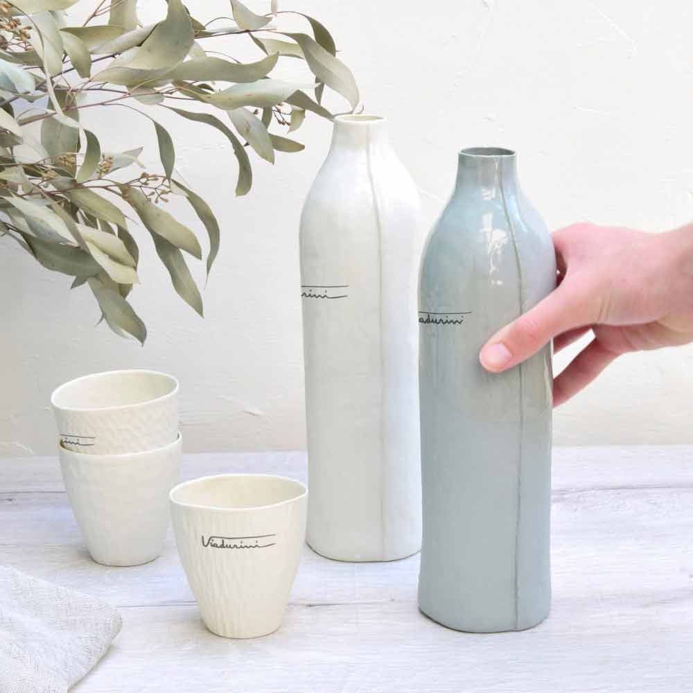 Dessa flaskor är gjorda av det finaste vita eller grå porslinet och ger elegans och förfining till bordet, för lyxig miljö i sällskap, vilket framkallar porslinets sensualitet och enkelhet utan att offra dess praktiska.