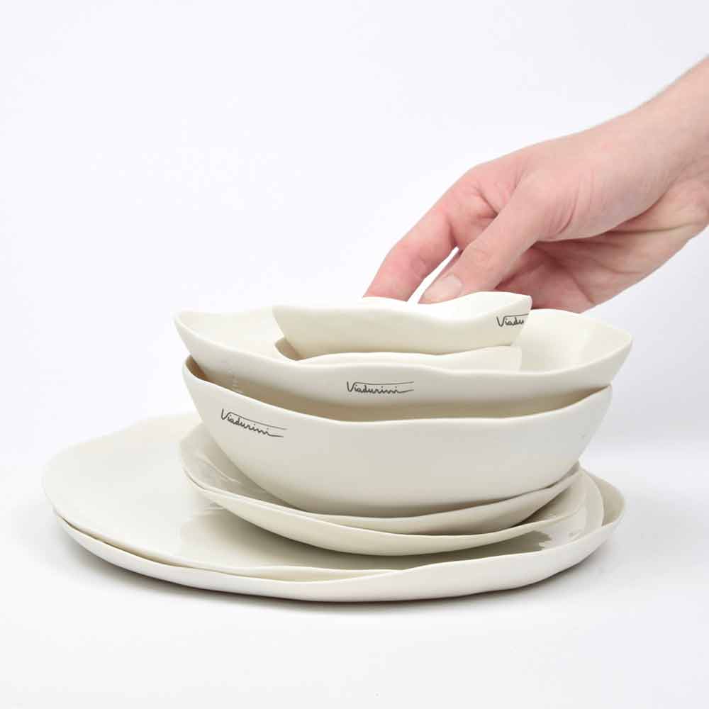 Det som kännetecknar denna tjänst, vilket gör den unik, är den organiska och naturliga designen, som lämnar yttrandefriheten för materialet: vi hittar således en krokig kant snarare än en rörelse som ges av lerdeformationen under tillagningen som blir karakteristiska och värdefulla element av produkten. .