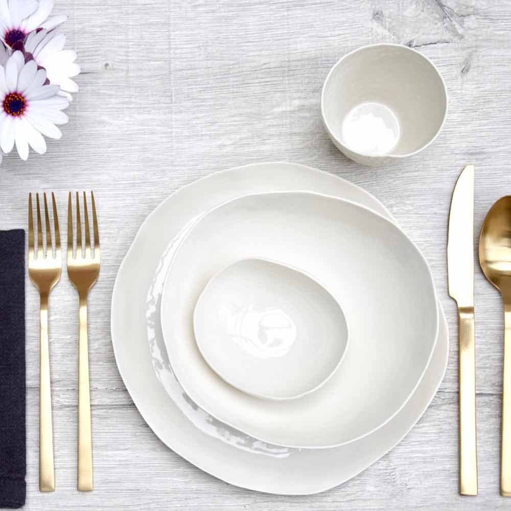 Tillverkad i finaste vitt porslin, denna uppsättning av rätter ger elegans och förfining till bordet, för lyxig miljö i sällskap.