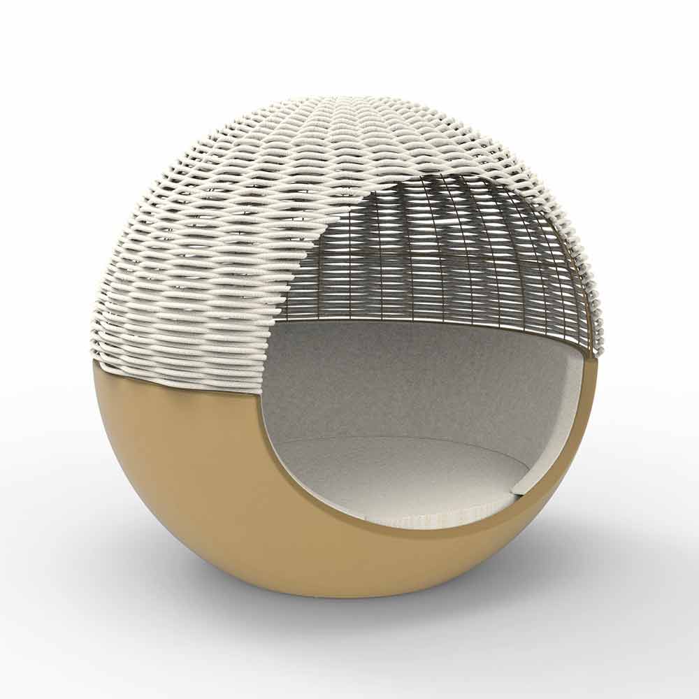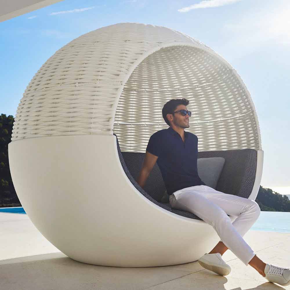 Rund dagbädd för utomhus med lyxig roterande design i polyeten och parasoll i vävt rep, olika färger.