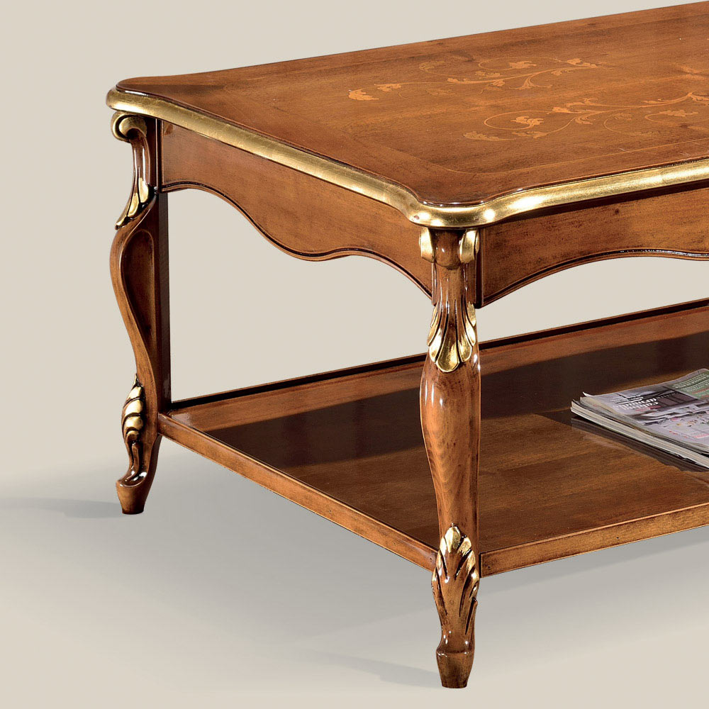 Rektangulärt soffbord av Bassano valnöt och antikguld, med infälld skiva och praktisk hylla.
