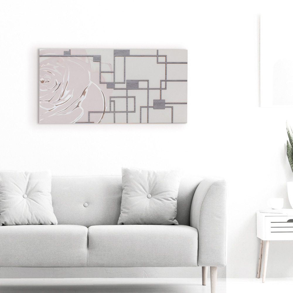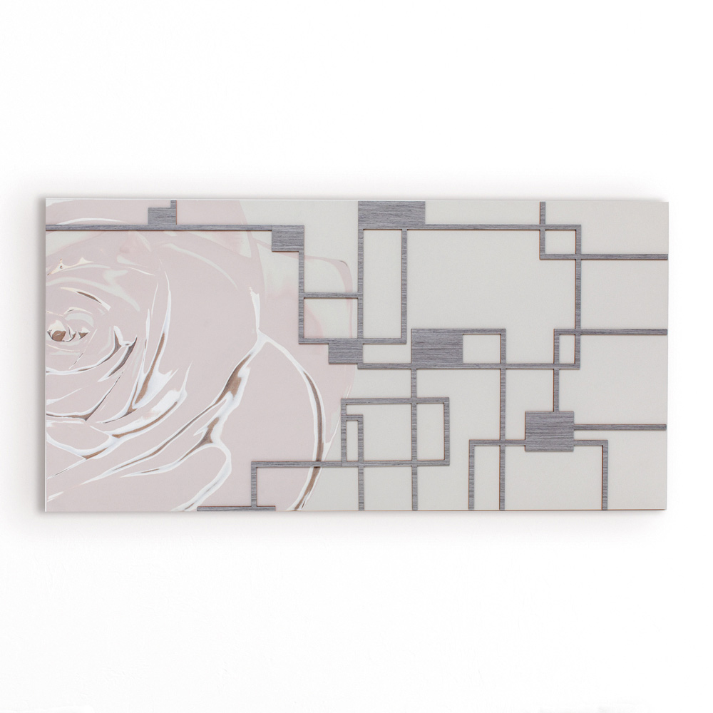 Den dekorativa panelen är gjord med lasermarkeringsteknik som skapar en basrelief på materialet, vilket skapar olika färggraderingar av kronbladen som skapas på panelen. Ramverket är tillverkat av sandlackerat trä med grå applikationer. Mjuka nyanser av rosa leker med den geometriska dekoren i grått trä.