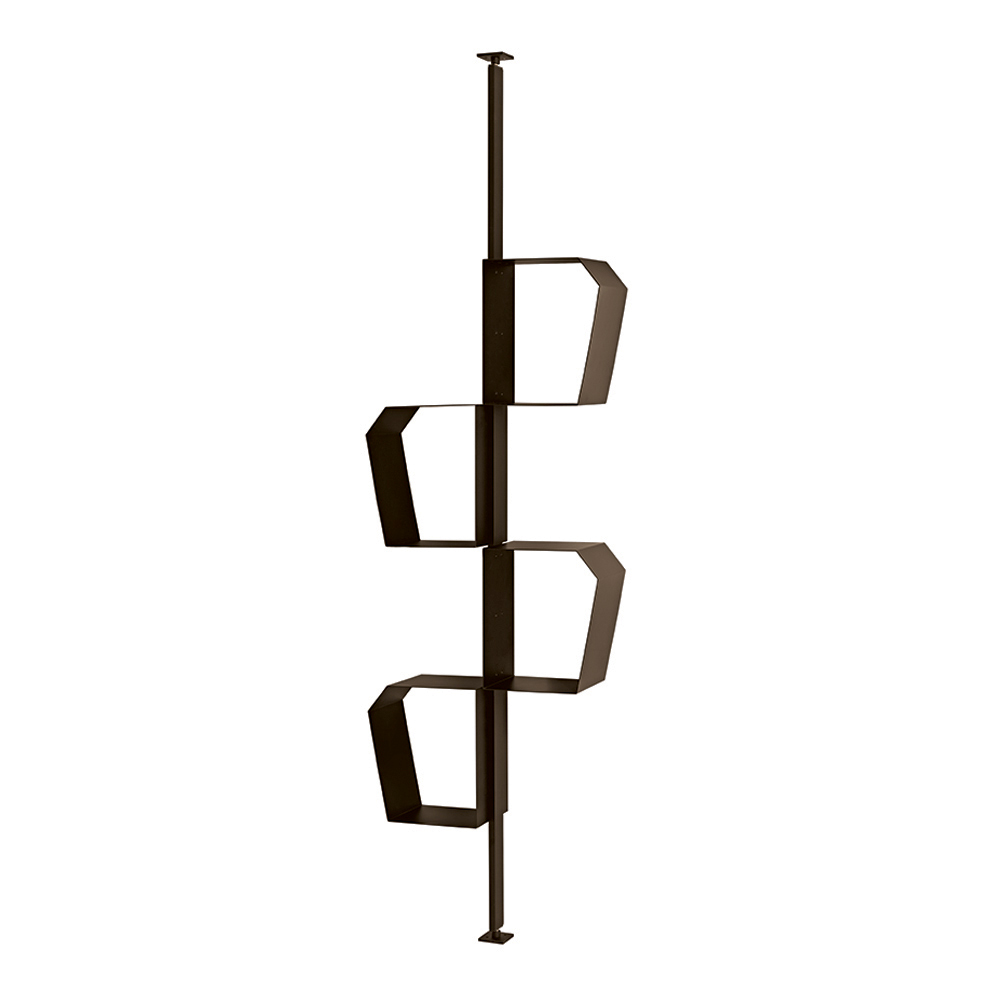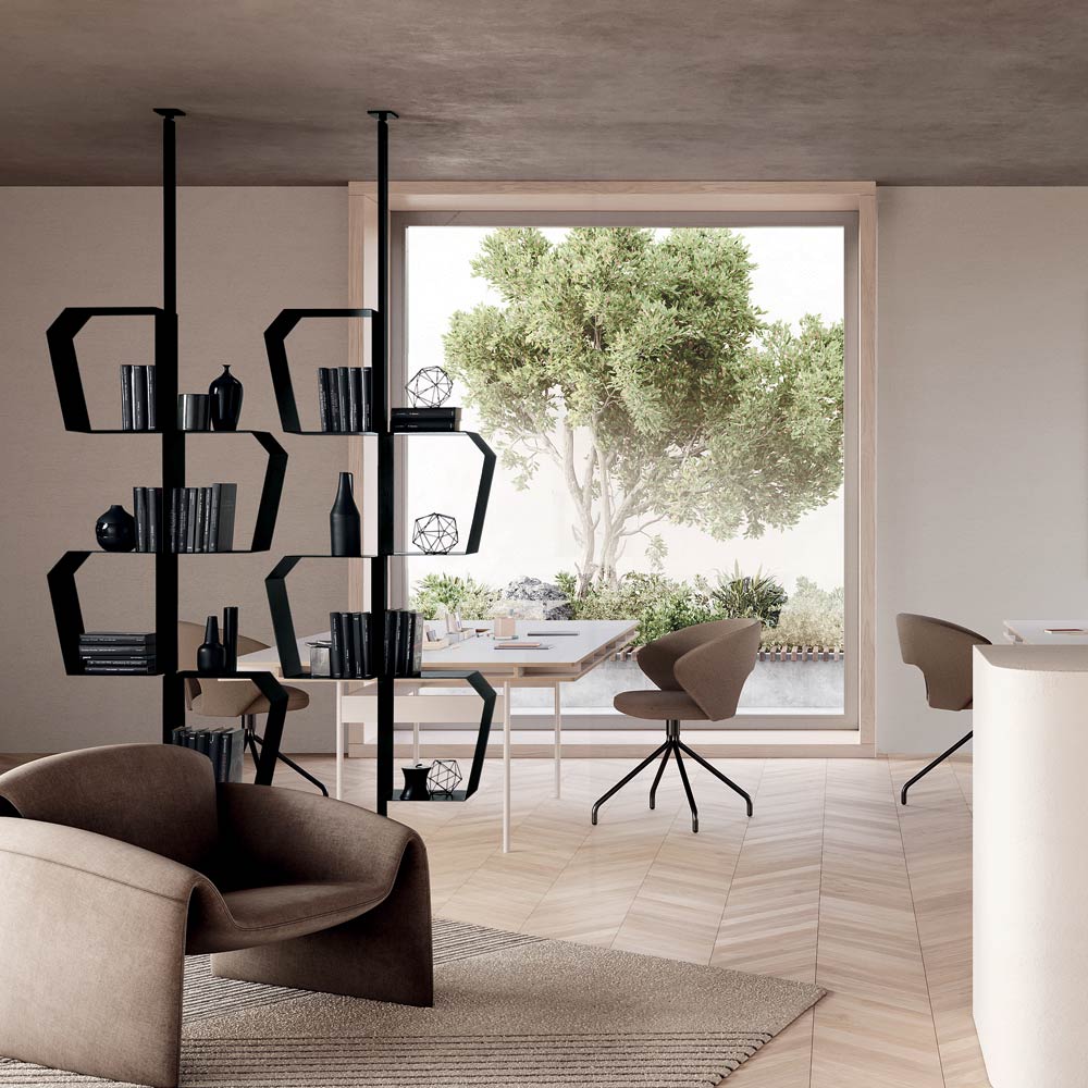 Tack vare sin mångsidiga konfiguration kan bokhyllan installeras med vägg- eller takfästen . I takversionen kan den även användas som ett avdelare , perfekt för att separera utrymmen samtidigt som den visuella lättheten bibehålls.