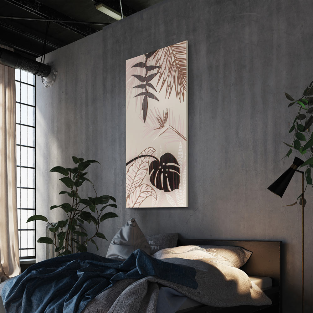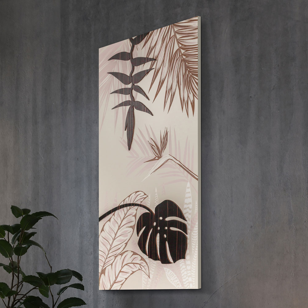 Den dekorativa panelen är gjord med lasermarkeringsteknik som skapar en basrelief på materialet, vilket skapar olika färggraderingar av bladen som skapas på panelen. Målningen är gjord av matt sandlackerat trä med applikationer i ebenholts . De andra färgerna på panelen, såsom rosa, brunt, ges genom lasermärkning.