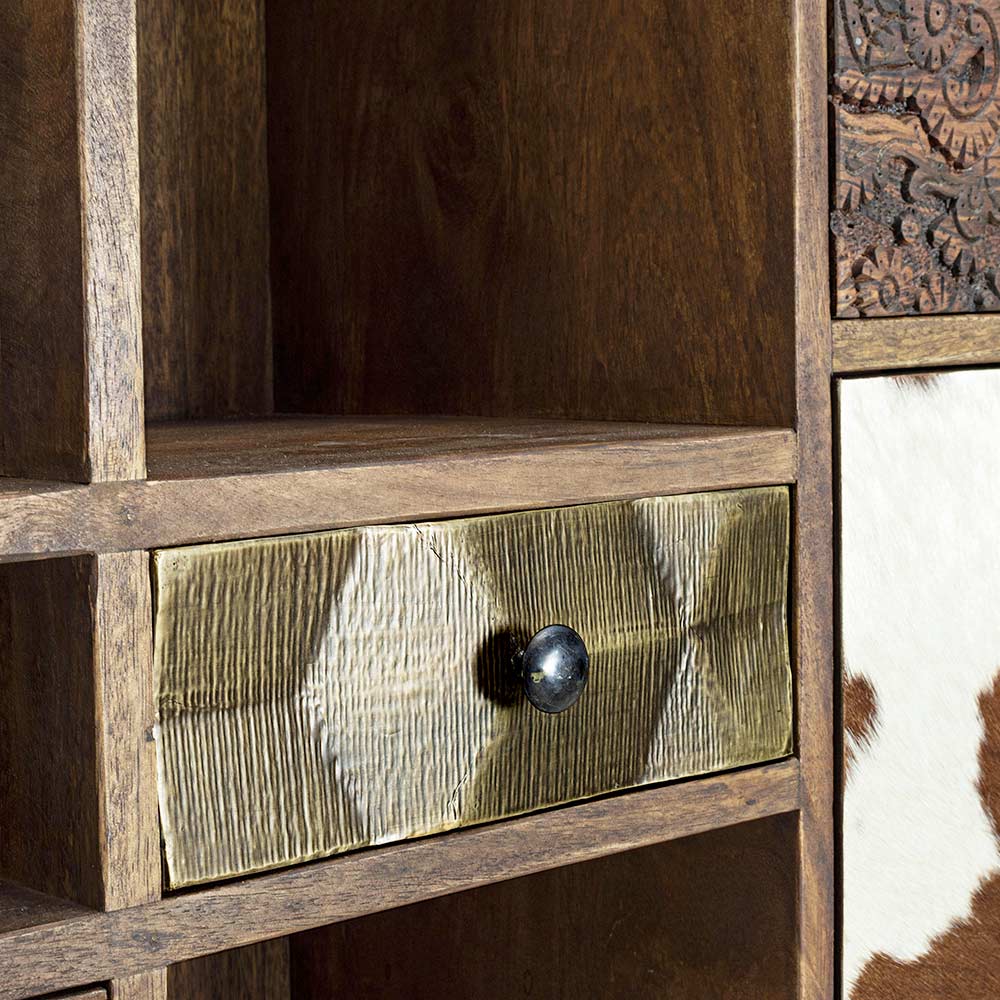 Framsidan av dörrarna är gjord av återvunnet mango- och akaciaträ med metall- och läderapplikationer.