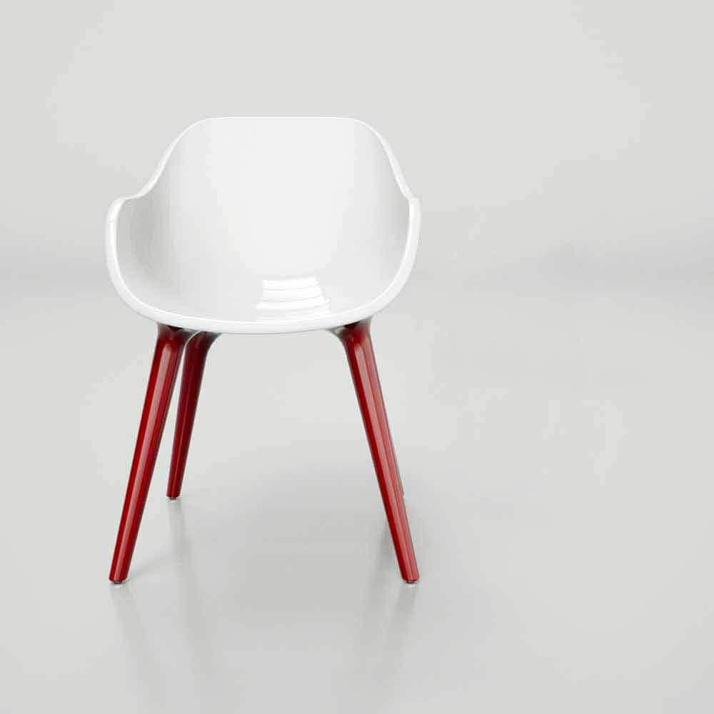 Benen smälte samman i skalet och dess mjuka linjer, framhävda av flera färgkombinationer, ger liv åt en mångsidig, kameleonisk och tidlös stol.