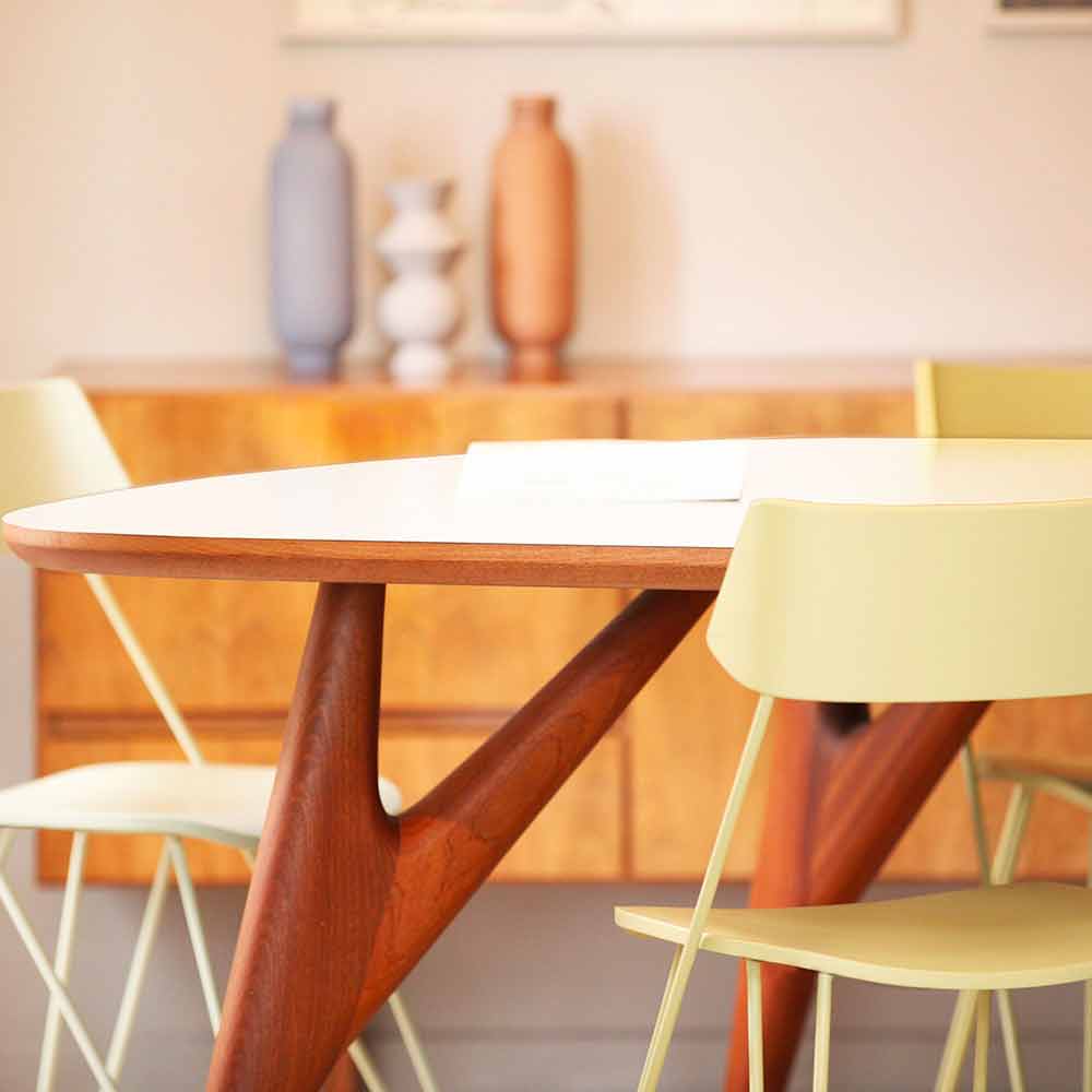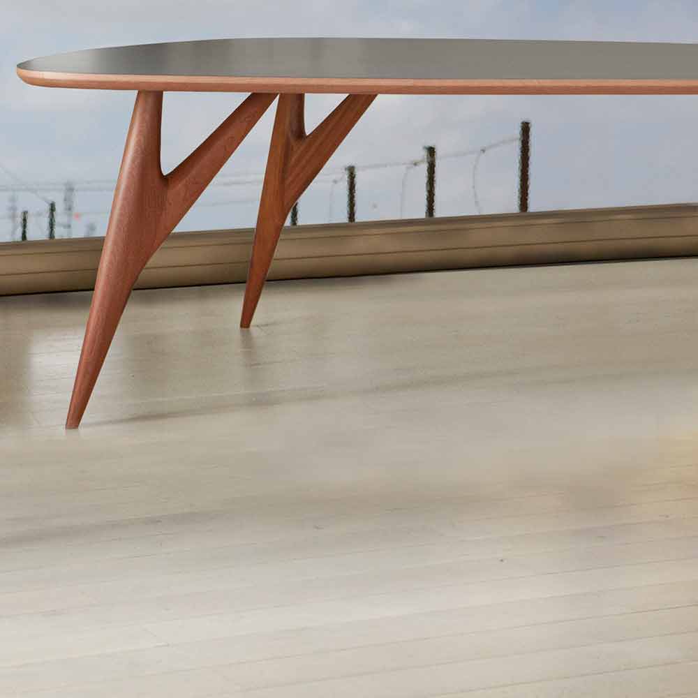 Modernt och originalt matbord helt handgjort i Italien med HPL-laminatskiva och massiv mahogny- struktur.