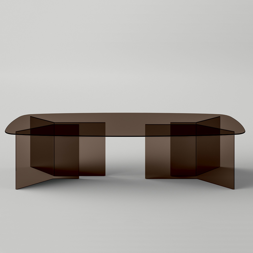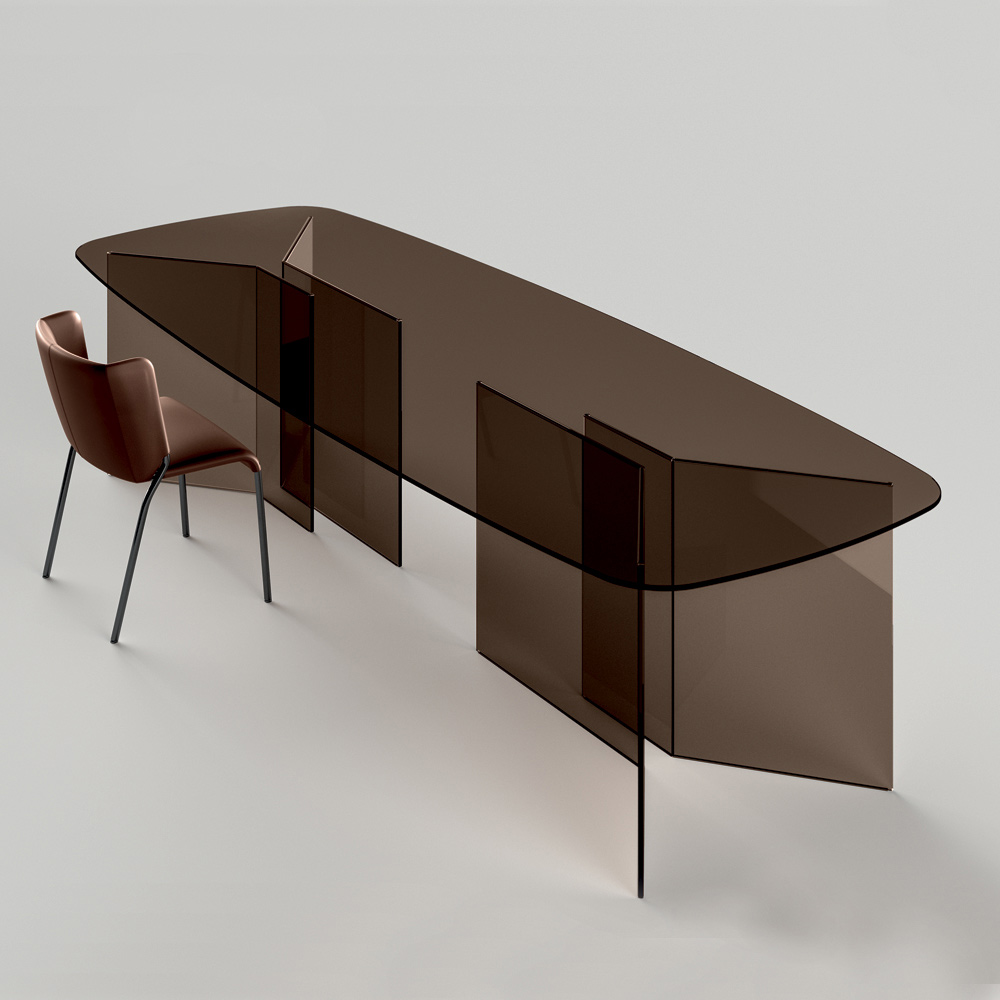 Matbord helt tillverkat av ultrabeständigt glas med en formad rektangulär skiva. Ett komplement med en raffinerad karaktär som kommer från en 100% Made in Italy produktionsprocess tack vare skickliga hantverkare experter på glasbearbetning, ett enda material som ger liv åt ett värdefullt designbord.