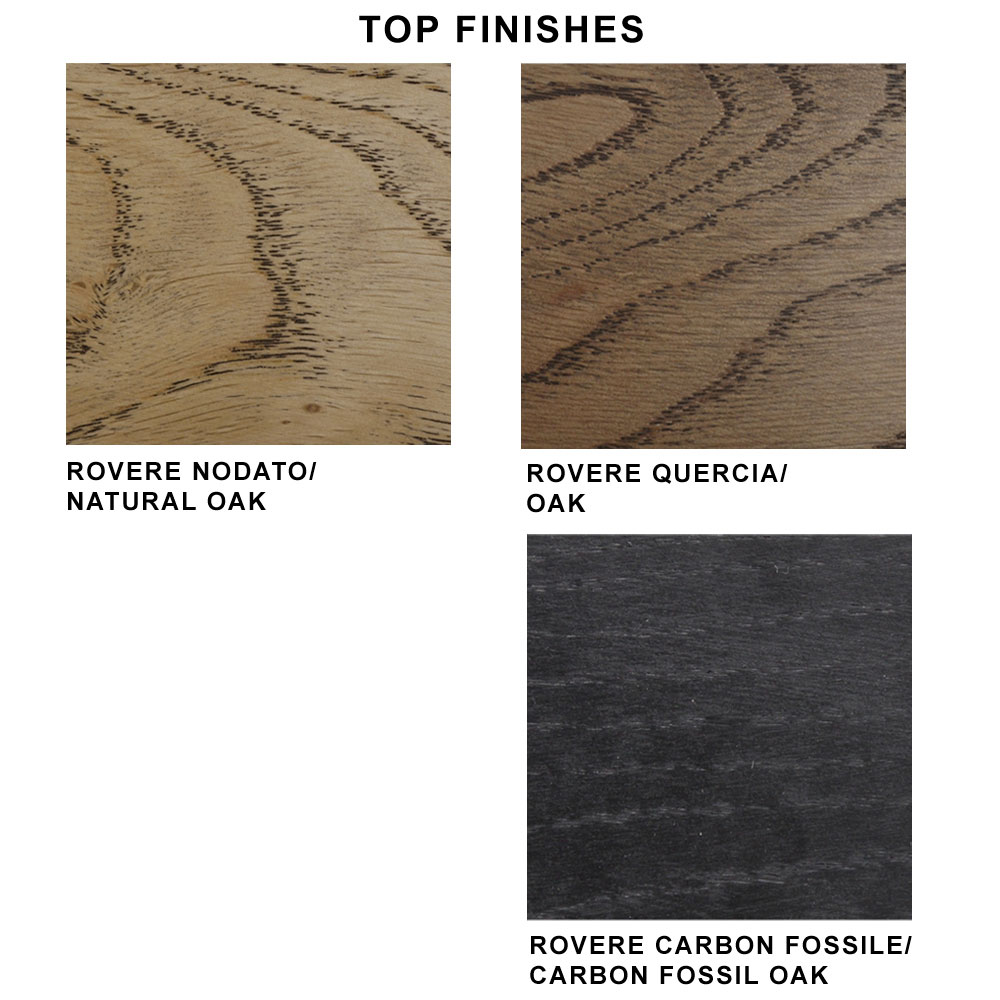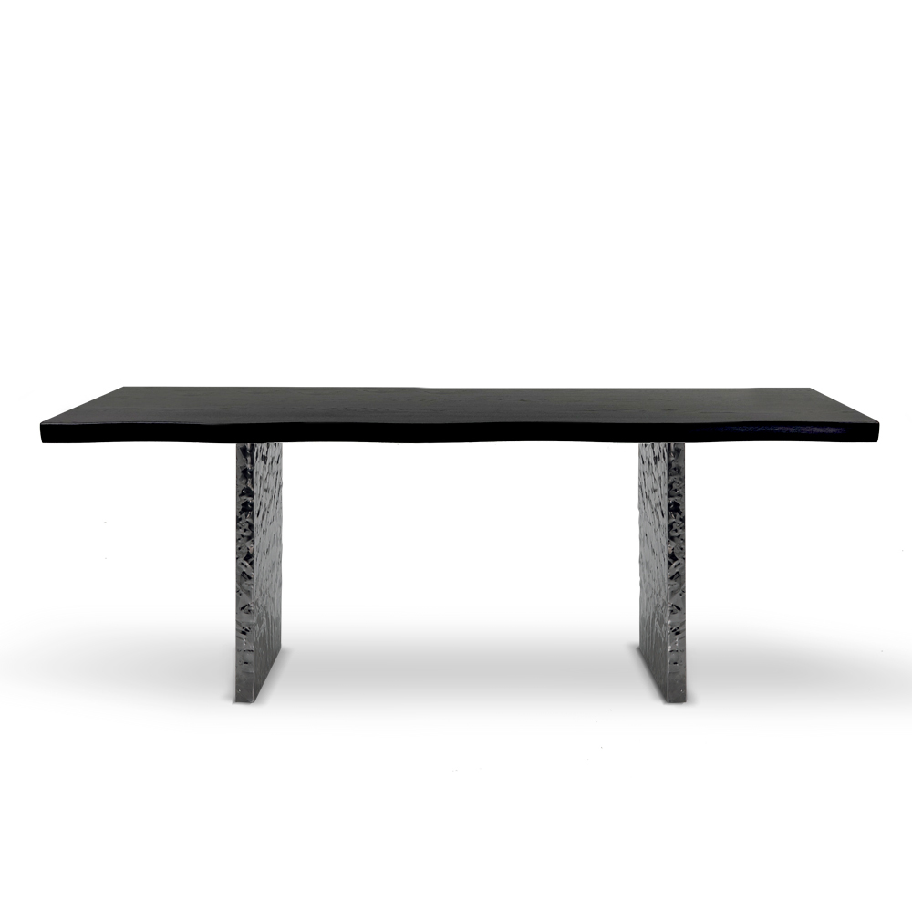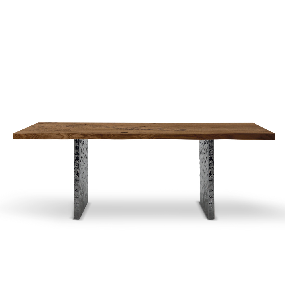 Designbord med skiva i fanerad trä och underrede i hamrat stål handgjorda i Italien.