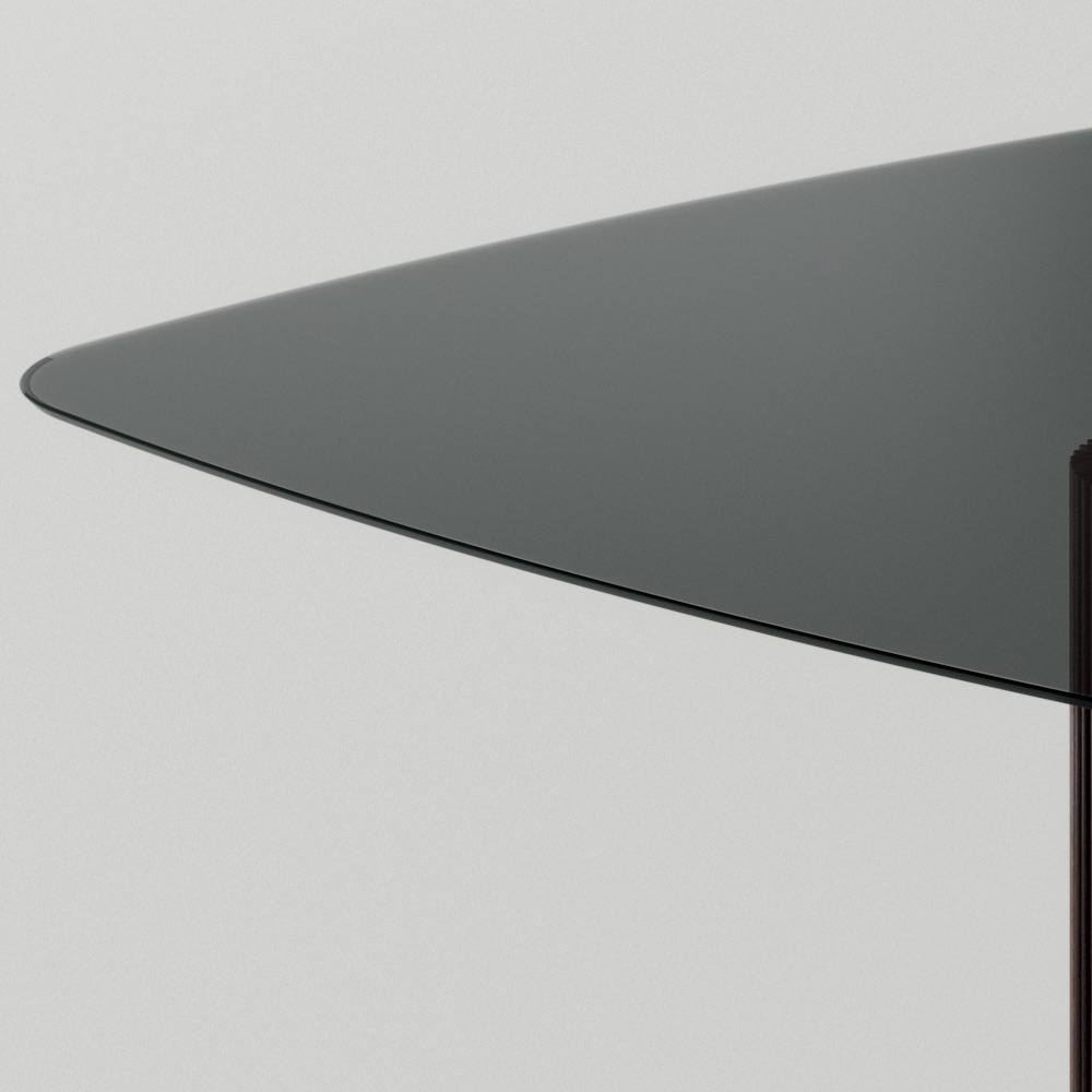 metallbas med en glänsande kromfinish. Skivan med sin rundade kant ger mjukhet till formerna, medan metallelementen kompletterar bordets design och berikar det med