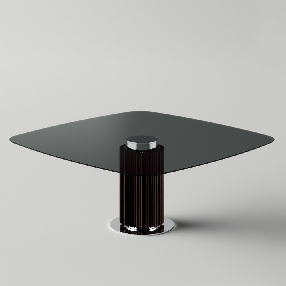 Fyrkantigt bord med rökt glasskiva och träunderrede Made in Italy.