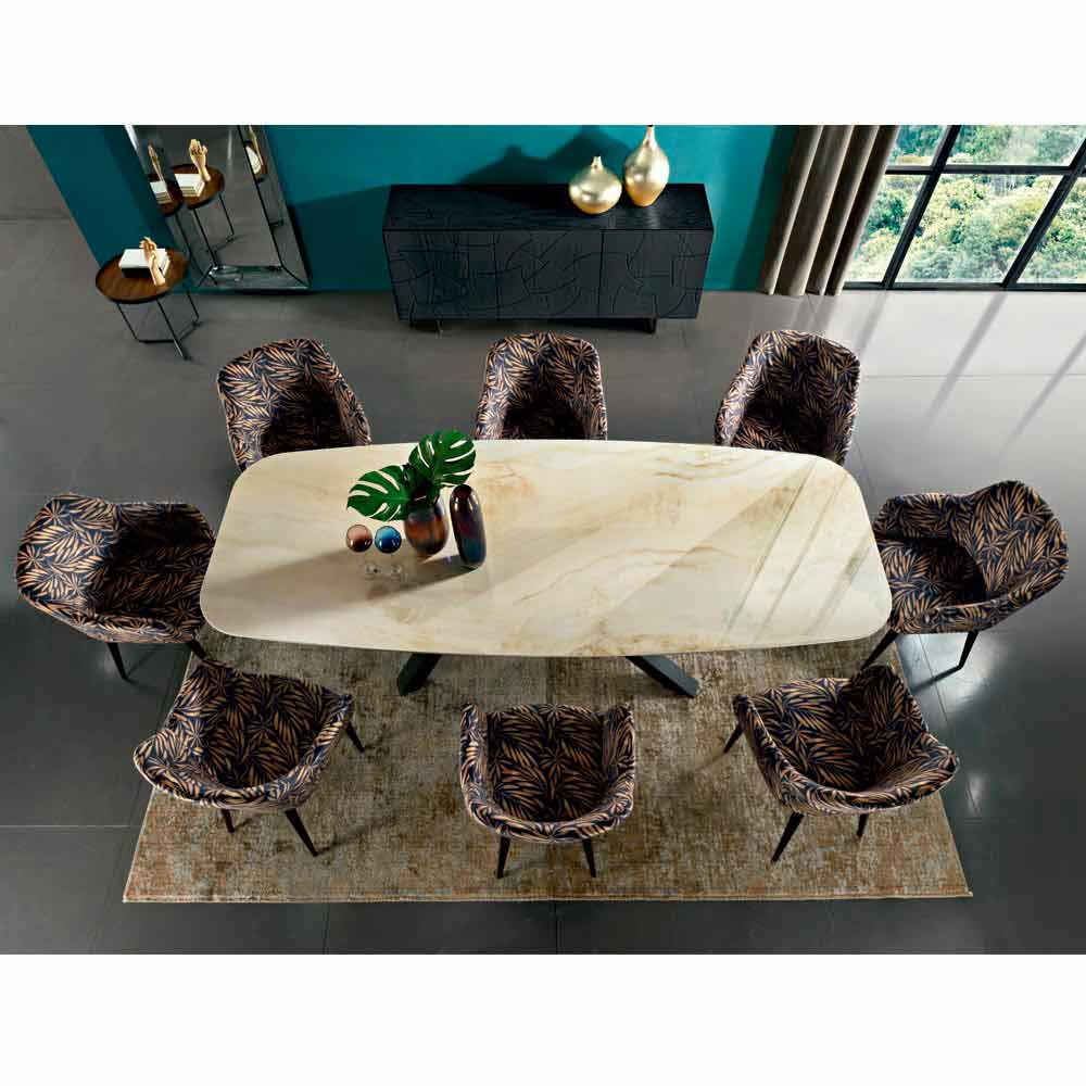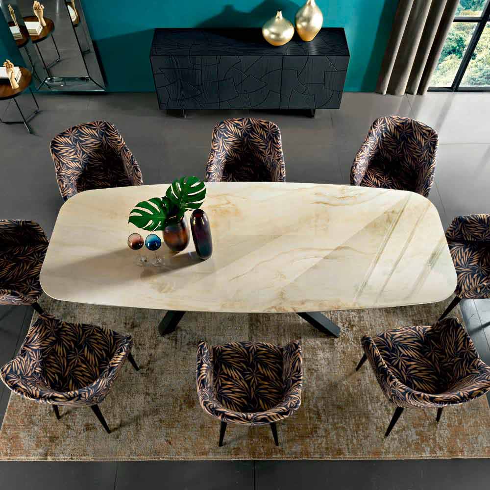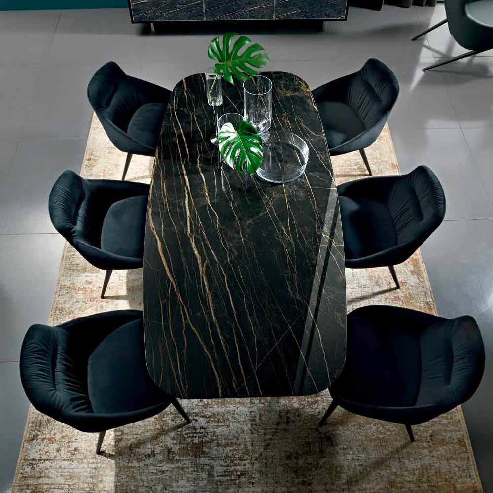 Matbord med fatformad skiva i keramik tillverkat i Italien, lyx.