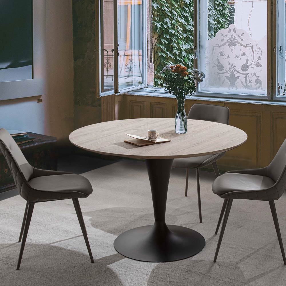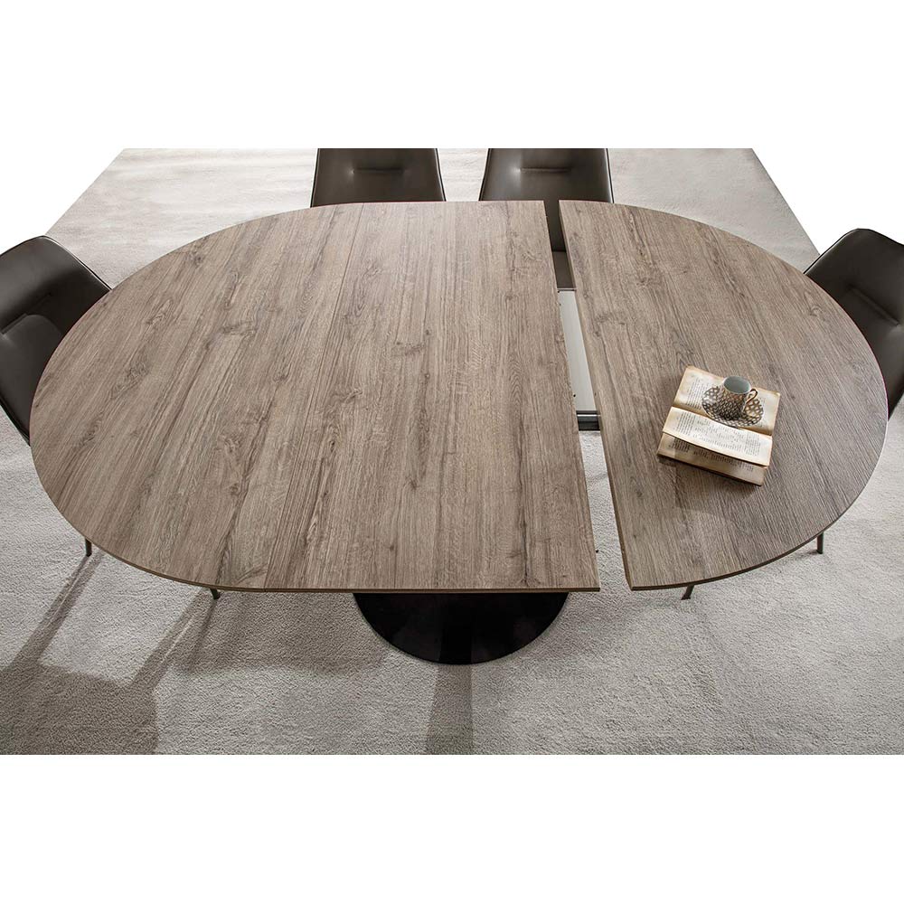 Underbart matbord med rund skiva i pläterat laminerat trä (h 30 mm), texturerad ekfinish med utsvängd kant i mdf och bas i svartlackerat stål . Det som gör detta bord unikt och särskilt funktionellt är möjligheten att förlänga skivan tack vare en utvändig förlängning på 50 cm, vilket får en maximal längd på 170 cm och gör att det kan rymma upp till 8 personer samtidigt som det garanterar ett litet bord. som kan optimera utrymmena i ditt hem när det är stängt. Elegans och funktionalitet är nyckelorden som bäst beskriver denna moderna möbel som förkroppsligar ett extremt modernt utseende som kan berika rummets estetik genom att komplettera möblerna med nykterhet.
