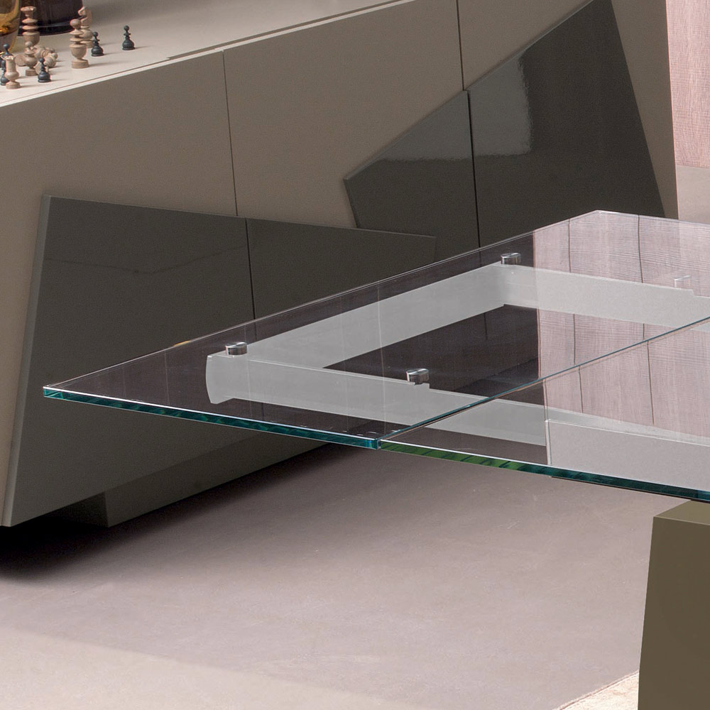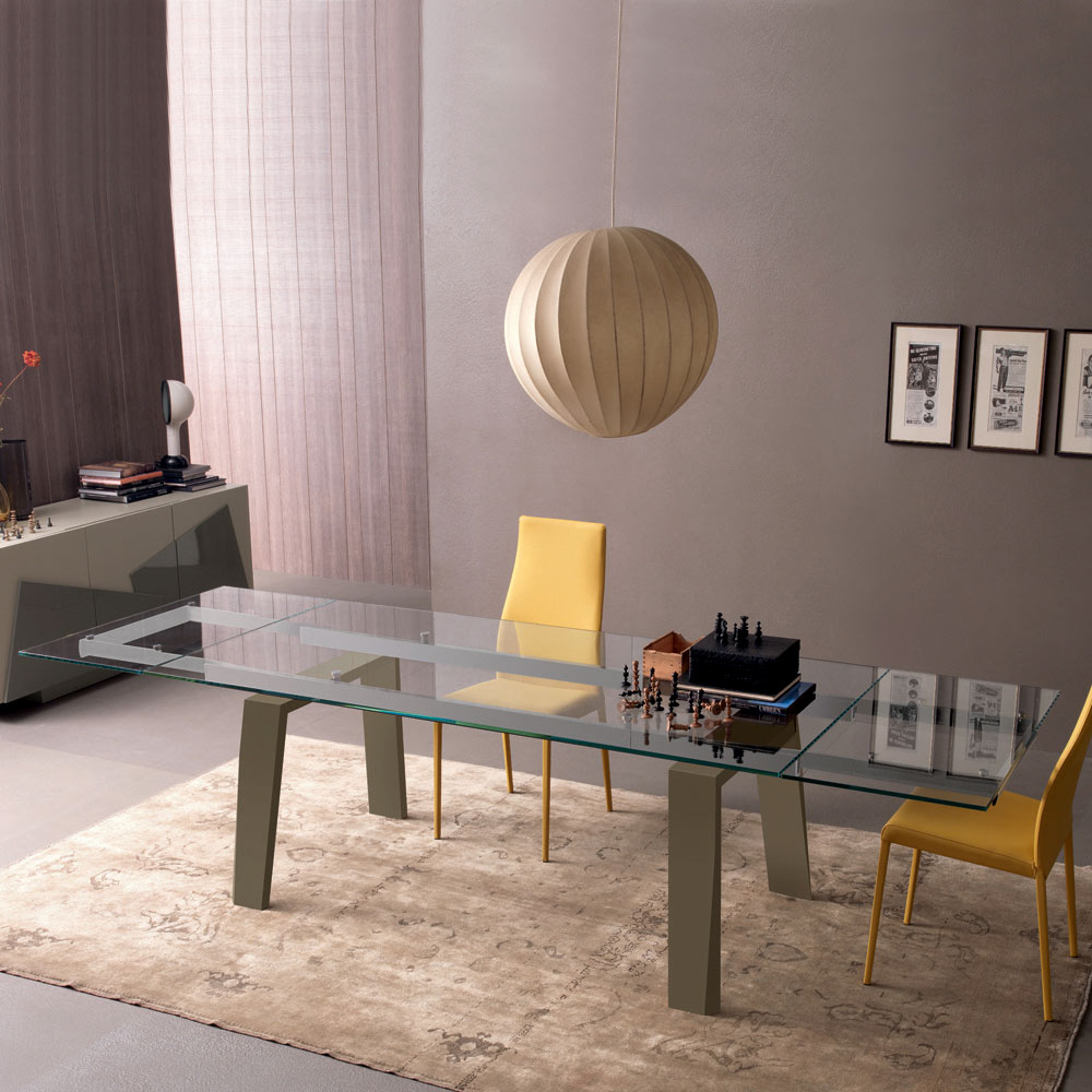 Utdragbart matbord i transparent glas och ben i lackat trä, 2 storlekar tillverkade i Italien.