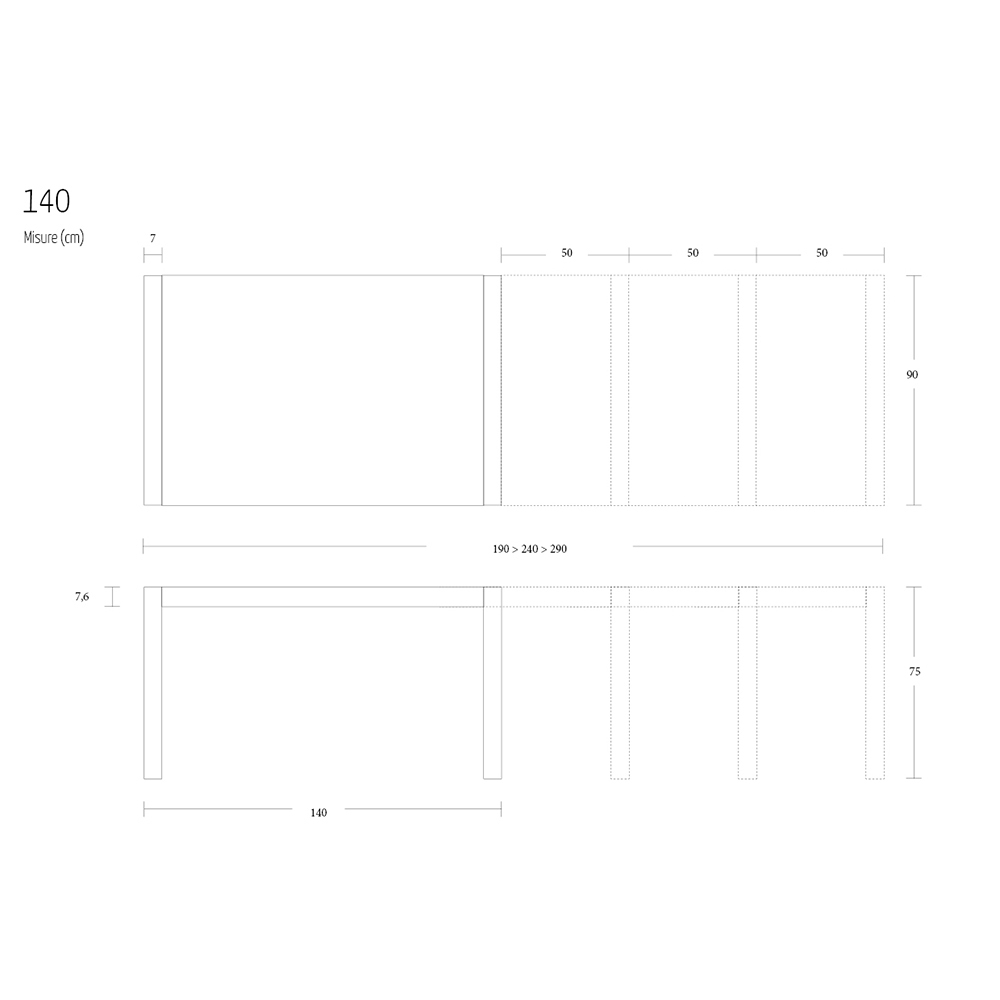 Tillgängliga storlekar:- L 140/190/240/290 x P 90 x H 75 cm - 3 förlängningsblad på 50 cm;