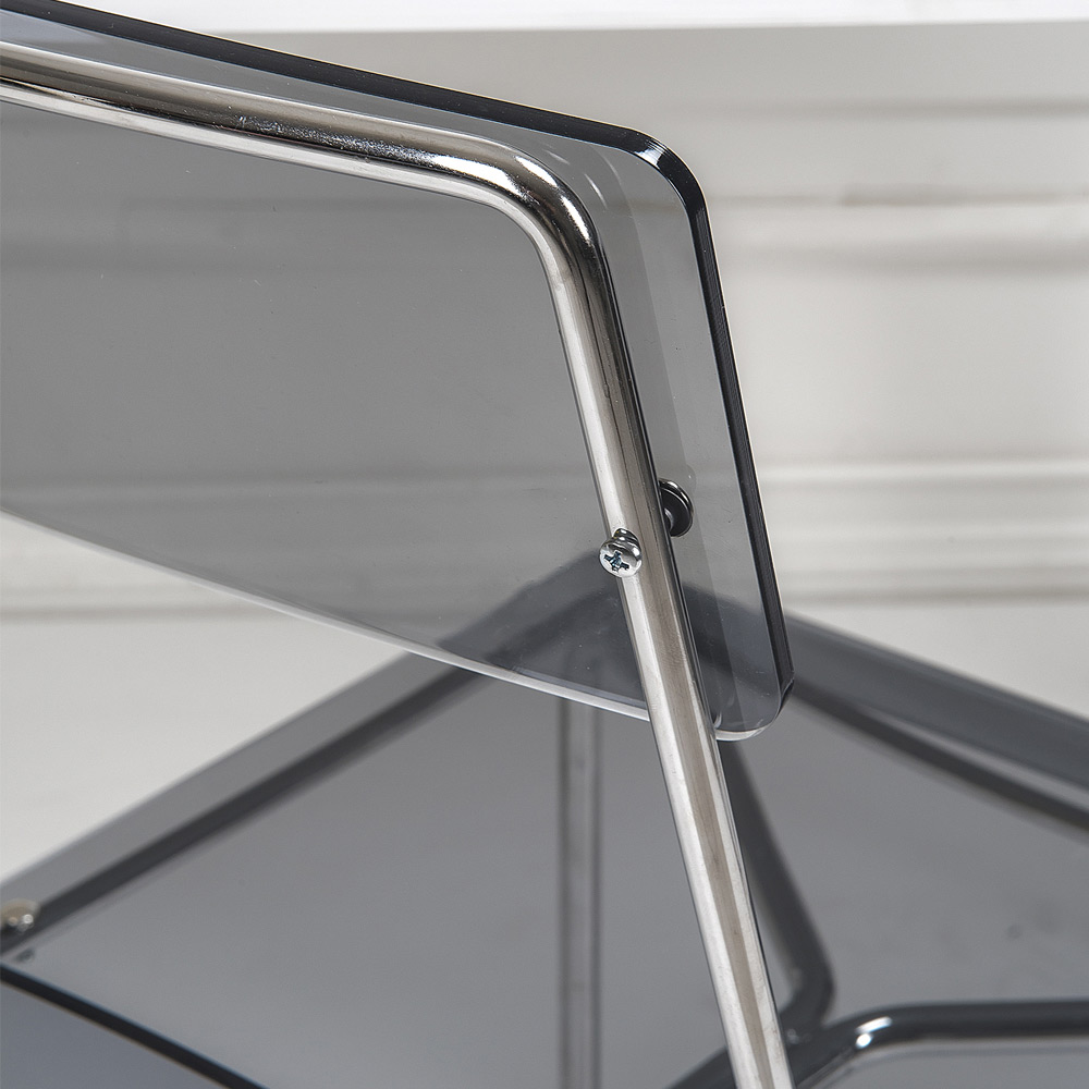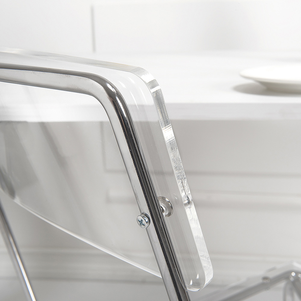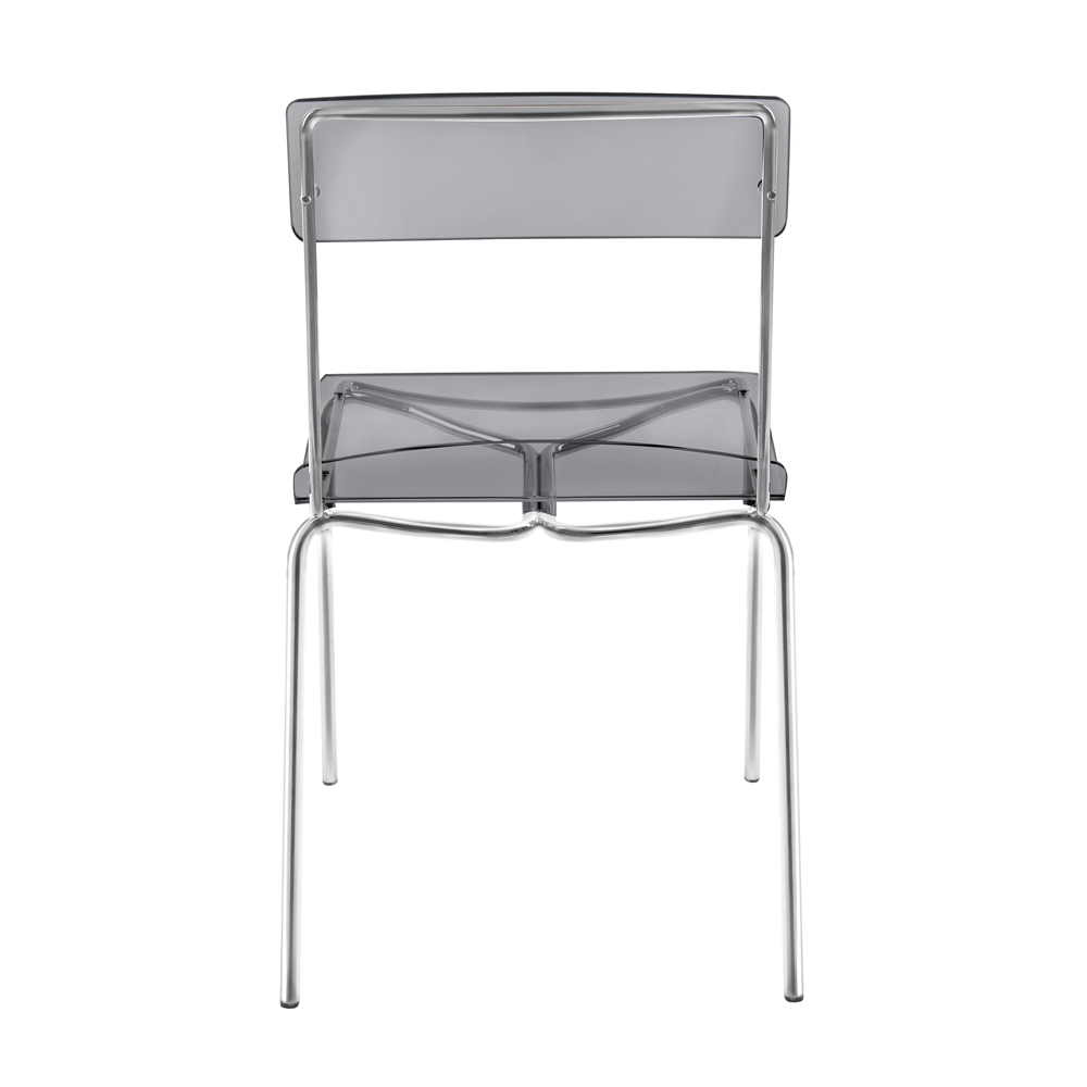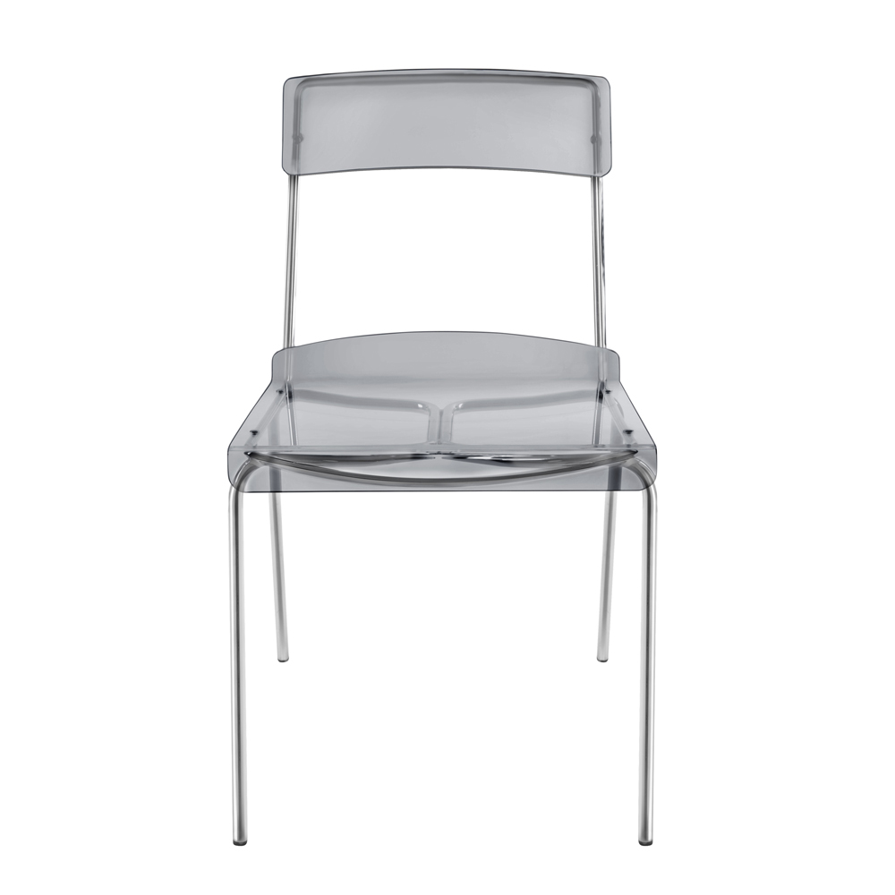 Matsalsstol med skal av plexiglas och silverkromad metallstruktur , helt tillverkad i Italien . En idealisk inredningslösning för den som söker enkelhet och mångsidighet för att kunna inreda sina hemutrymmen med en modern karaktär och hög funktionalitet . Formen på strukturen gör det också möjligt att stapla dem, vilket gör det till en perfekt idé även för kontraktsutrymmen som barer och restauranger.