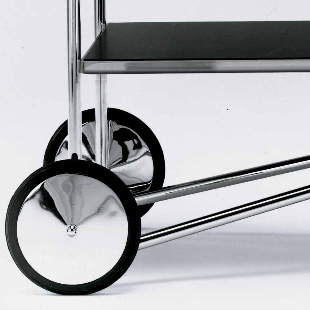 Matvagn med kromat stålkonstruktion utrustad med 3 hjul och två hyllor i svartlaminat. Praktik och design går samman för att ge liv åt en mycket funktionell och extra möbel i hemmiljön vars användning underlättas ännu mer av de praktiska hjulen som gör att den kan flyttas snabbt och enkelt. Förutom en rent funktionell sida erbjuder denna matvagn ett innovativt och förfinat estetiskt ideal för dem som vill komplettera sina möbler med en touch av ny stil .