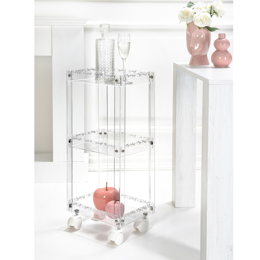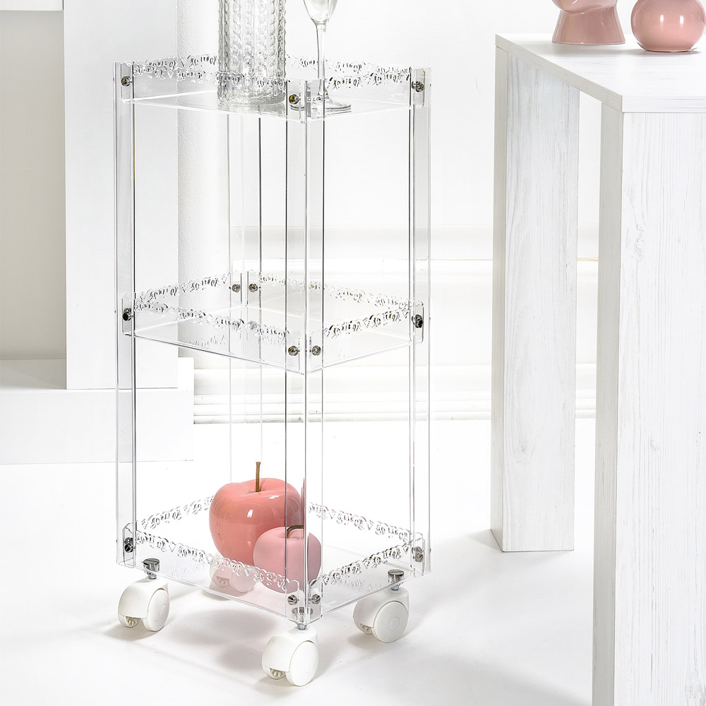 Praktisk och mångsidig matvagn , gjord av 100 % PMMA plexiglas från jungfrulig polymer. En produkt med modern och linjär design som kännetecknas av närvaron av 3 hyllplan vilket gör den mycket användbar som hjälpvagn i hemmiljön. Ett komplement där estetik möter funktionalitet. Designad, designad och tillverkad i Italien , med material av hög kvalitet .