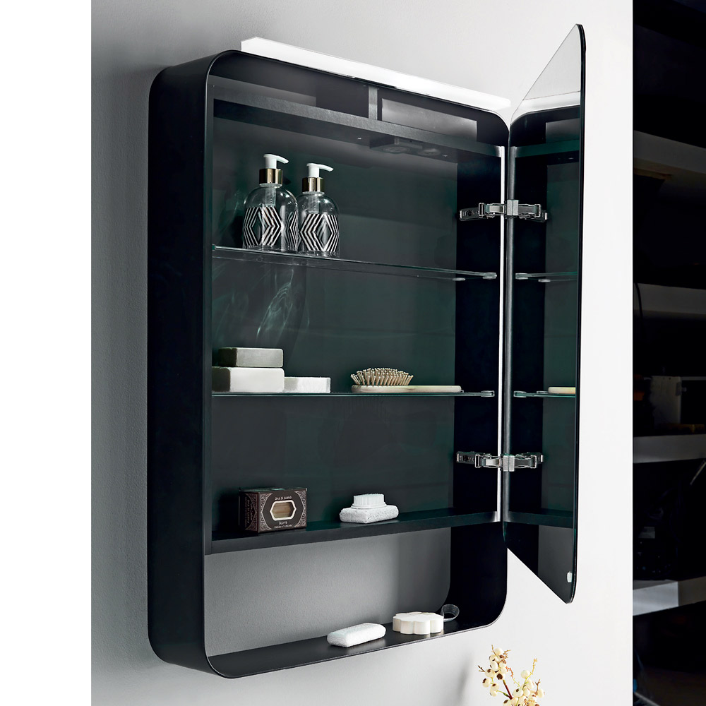 Den enda dörren öppnas för att avslöja ett praktiskt förvaringsutrymme, perfekt för att hålla dina skönhets- och vårdartiklar snyggt och lättillgängligt. LED-lampan ger optimal belysning, nödvändig för dagliga skönhetsrutiner, samtidigt som den ger en modern touch.