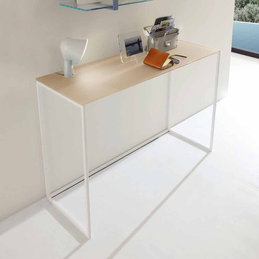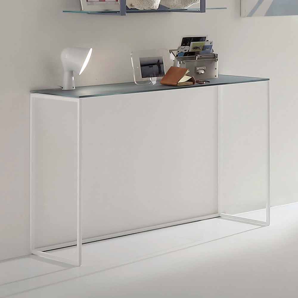 Modern konsol tillverkad i Italien med glasskiva och vitmålad metallkonstruktion . En enkel och mångsidig möbleringslösning som kan karakterisera alla utrymmen genom att ge en touch av stil till den omgivande miljön. Dess väsentliga linjer gör att den kan spela rollen som en praktisk stödyta i olika delar av huset, såsom ingången eller vardagsrummet, vilket samtidigt visar sig vara ett perfekt dekorativt element som kan komplettera möblerna. Tack vare valet kombinerar du den obestridda moderniteten hos metallen med kristallens tidlösa elegans och dess underbara finish, och det slutliga resultatet kommer att erbjuda en innovativ och original idé som kan göra varje rum unikt, om än i sin extrema enkelhet.