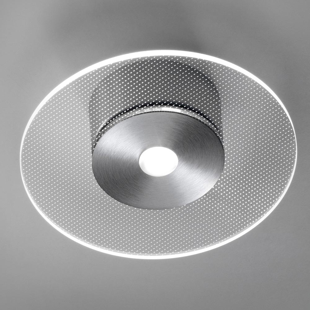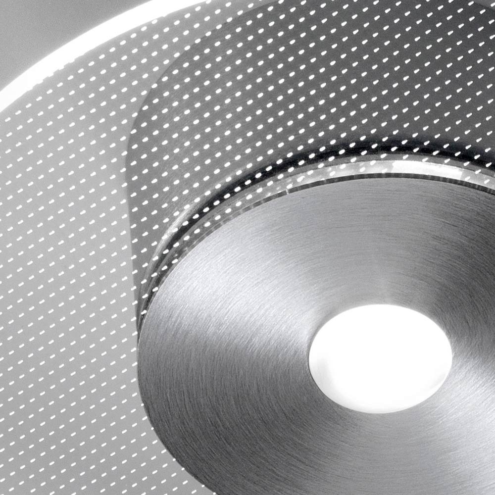 Taklampa för inomhusbruk tillverkad med en metallkärna och en plexiglasstruktur (PMMA) med mikropunktsbearbetning som möjliggör större ljusspridning.