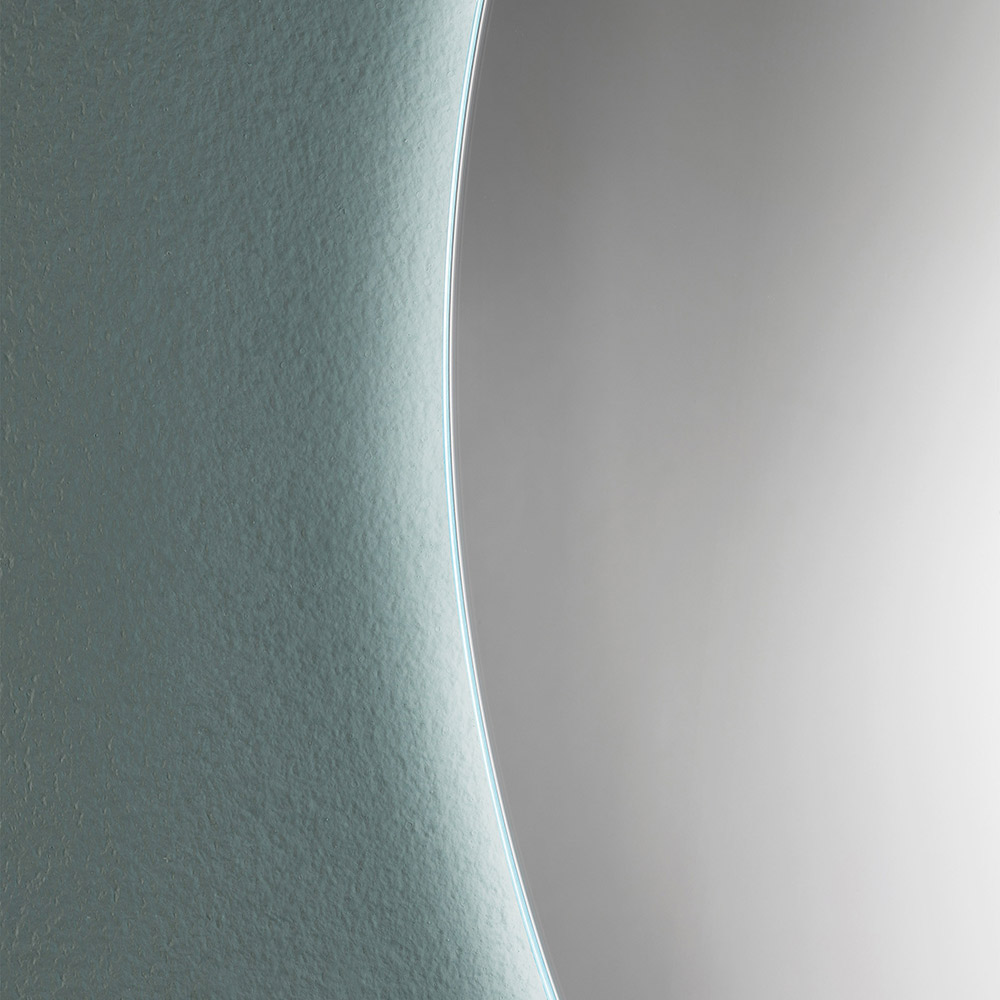 Rund badrumsväggspegel med polerad kant och LED-bakgrundsbelysning, tillverkad i Italien.