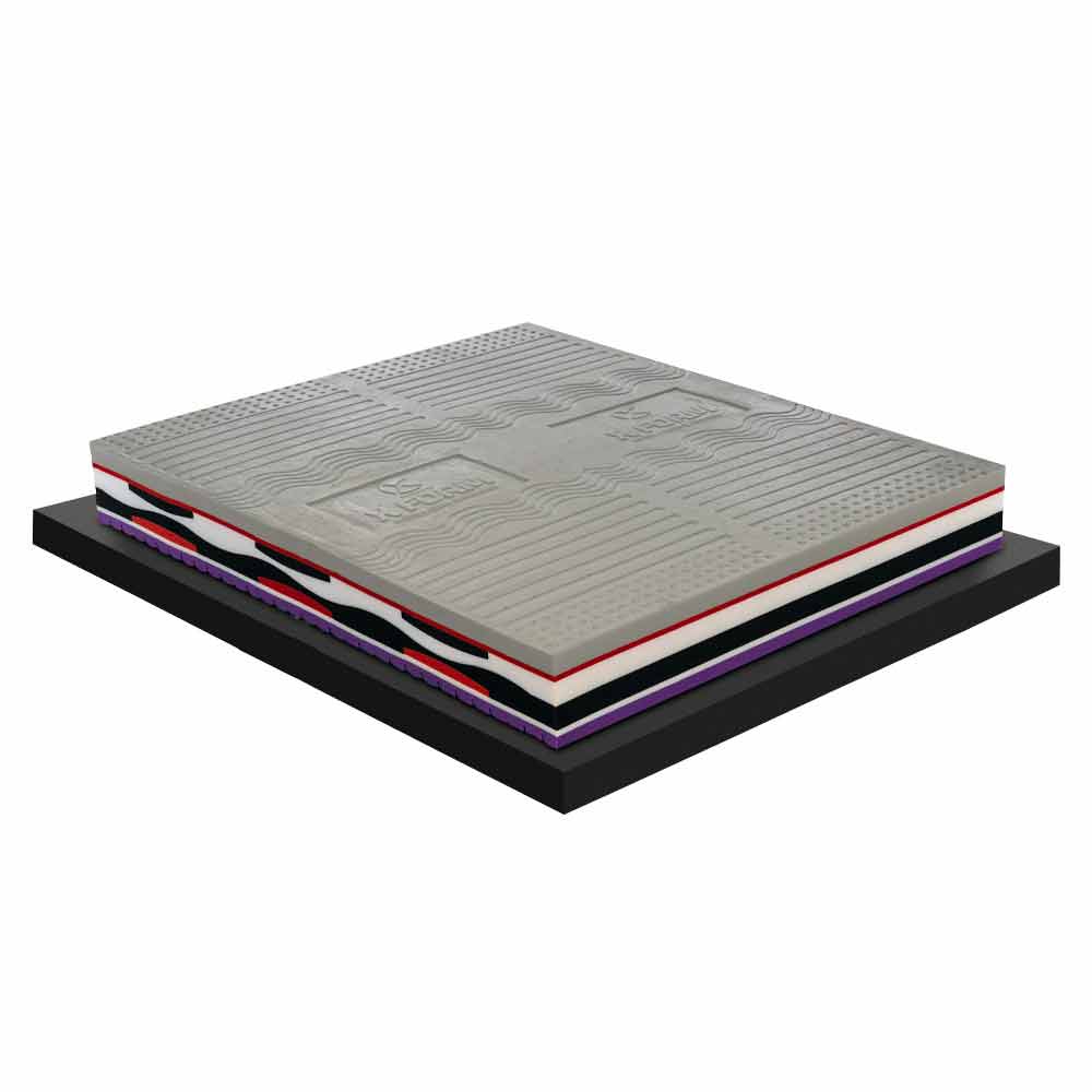 - 1,5 cm densitet 25 kg / m3 vit + 3,5 cm densitet 40 kg / m3 lila skum.