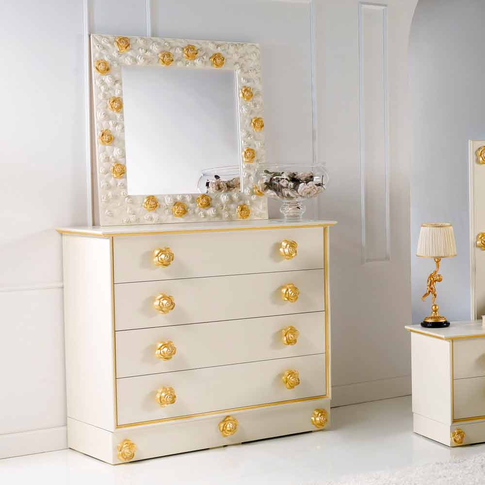 Spegeln Flower kännetecknas av en hantverks genomföras med användning av material av hög kvalitet och med användning av erfarenhet av skickliga italienska hantverkare. Ramen är gjord av trä och är dekorerad med rosor. guld grädde yta inlagd. Spegelglas, 4mm tjock. Made in Italy. Från hang både vertikalt och horisontellt.