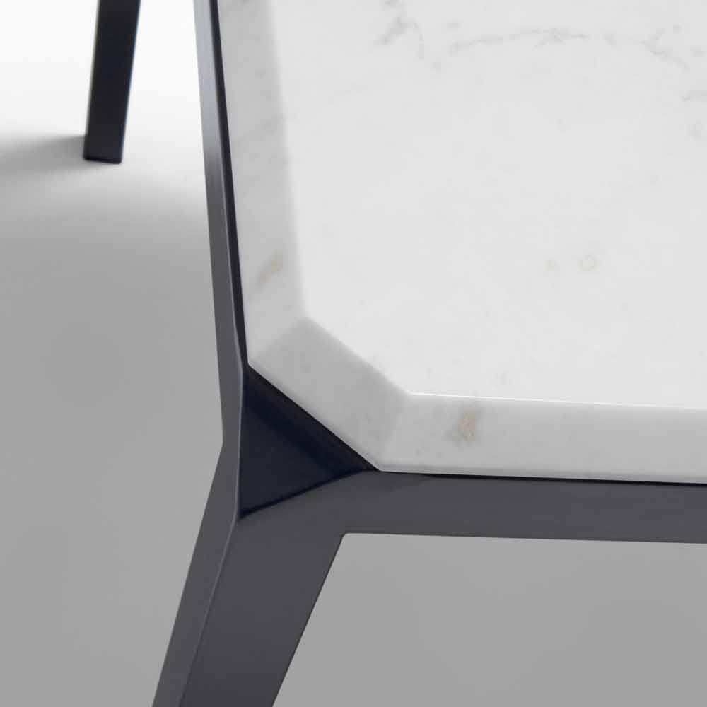 Sockel i pärlsvartlackerat stål och topp i vit Michelangelo-marmor.