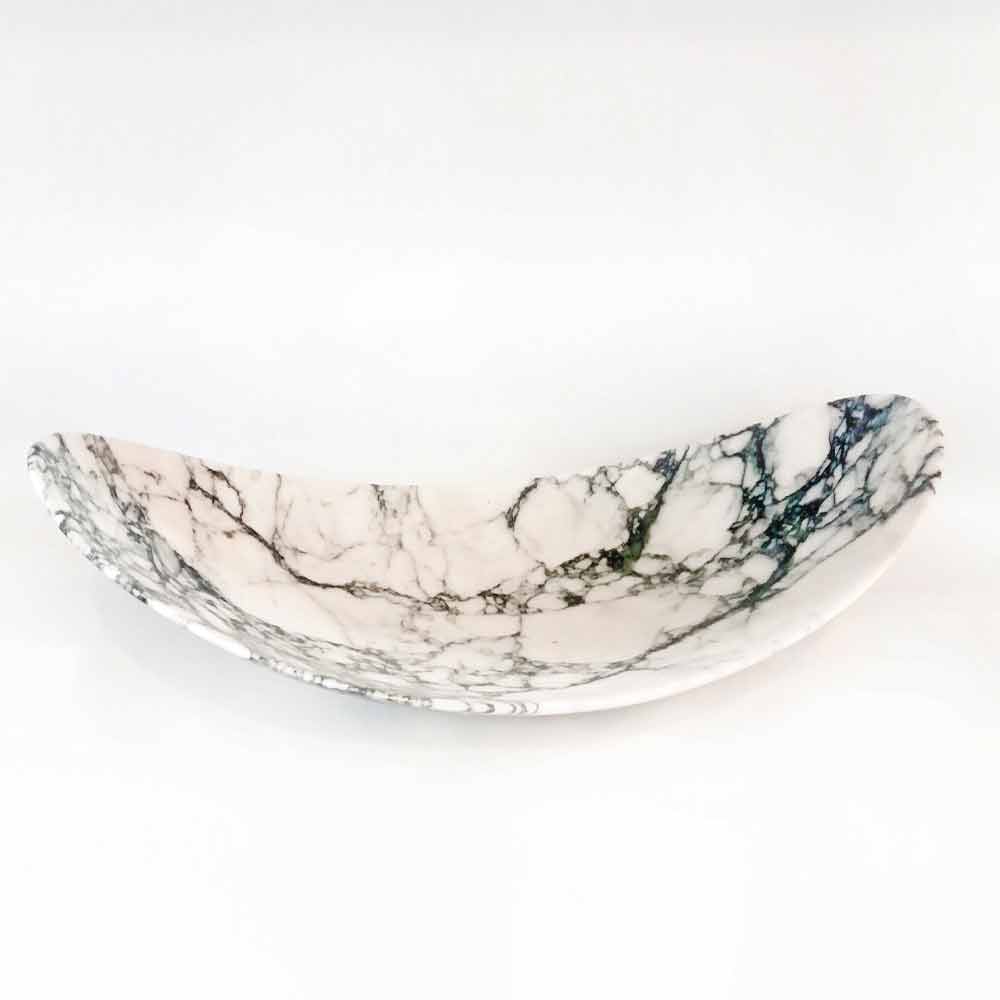 Mittpunkt kännetecknad av en sofistikerad design och dess form med slingrande och harmoniska linjer som ger produkten ett lätt och modernt utseende. Tillverkad i Italien för hand i Paonazzo-marmor , ett kompakt, finkornigt material med en elfenbenbas som tenderar att vara beigegul och purpurröd med vener i nyanser av svart, grönaktig.