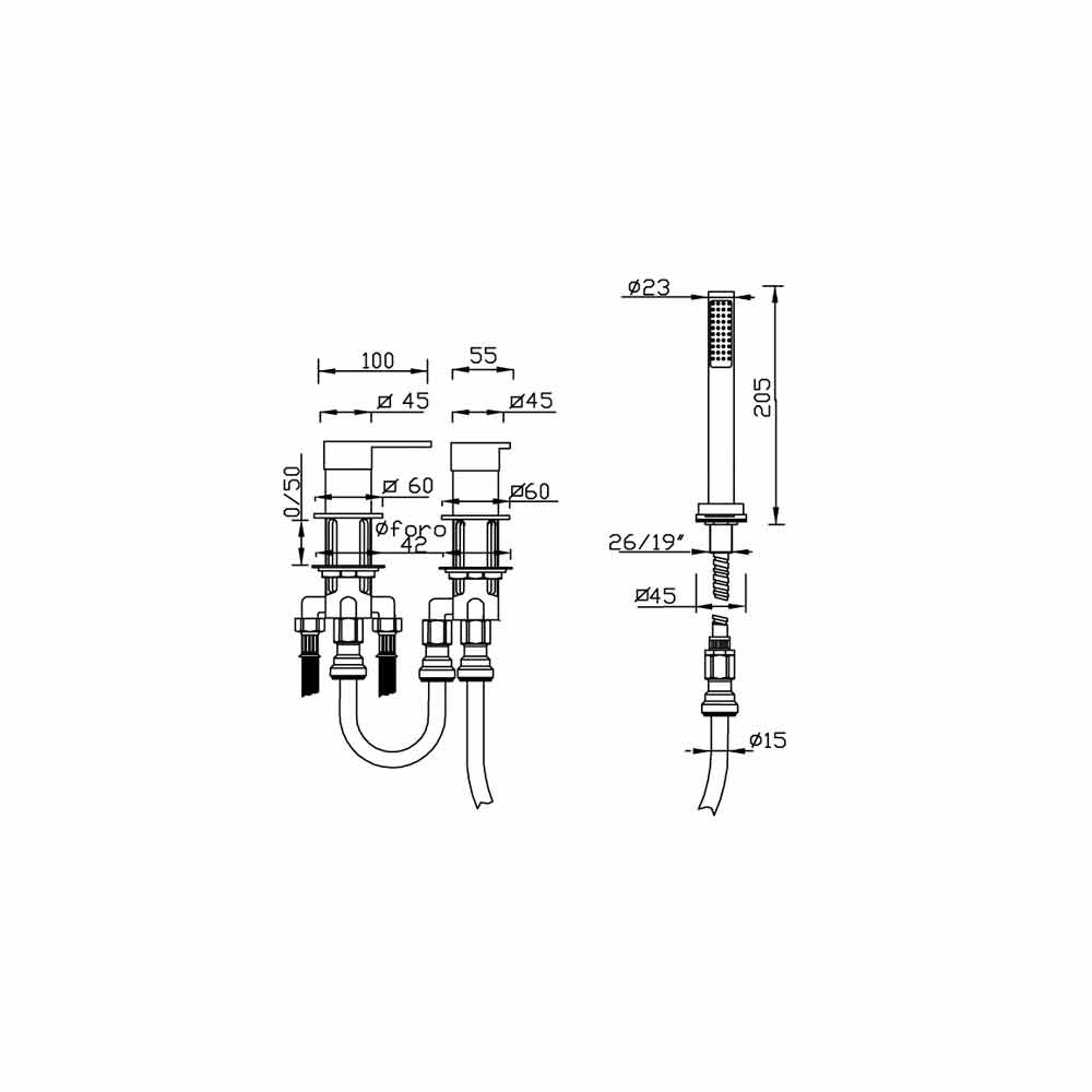 3-håls krom kantmonterad badkarsblandare utan pip och med duschsats. Helt tillverkad i Italien i mässing ; med högkvalitativa material som överensstämmer med europeiska standarder.