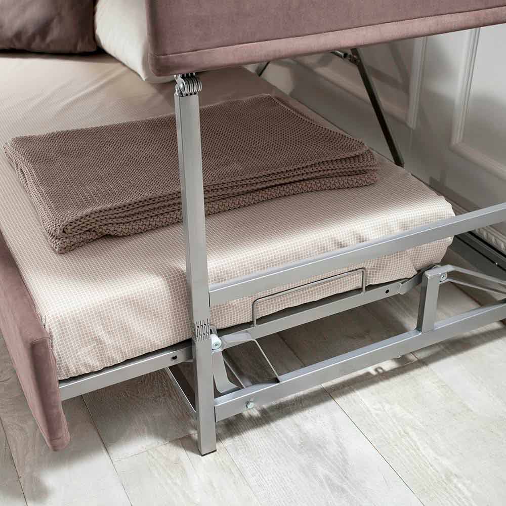 mekaniskt nätverk med en stålrörsram som stöder vikten av två vuxna utan att deformeras och 2 icke-deformerbara madrasser av polyuretanskum (densitet 25 kg / m3). En funktionell idé som inte ger upp utseendet och lyckas erbjuda en andra säng utan att öka dess storlek tack vare den