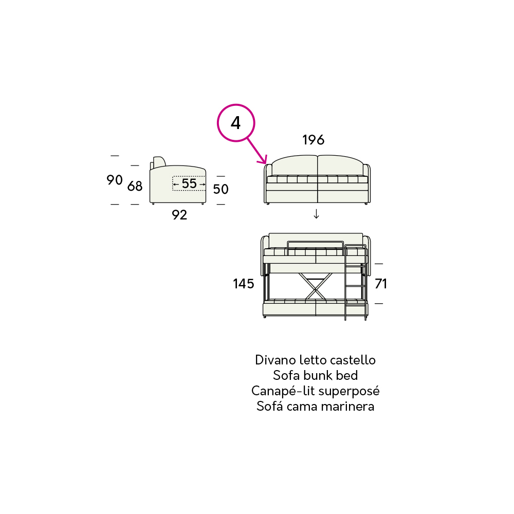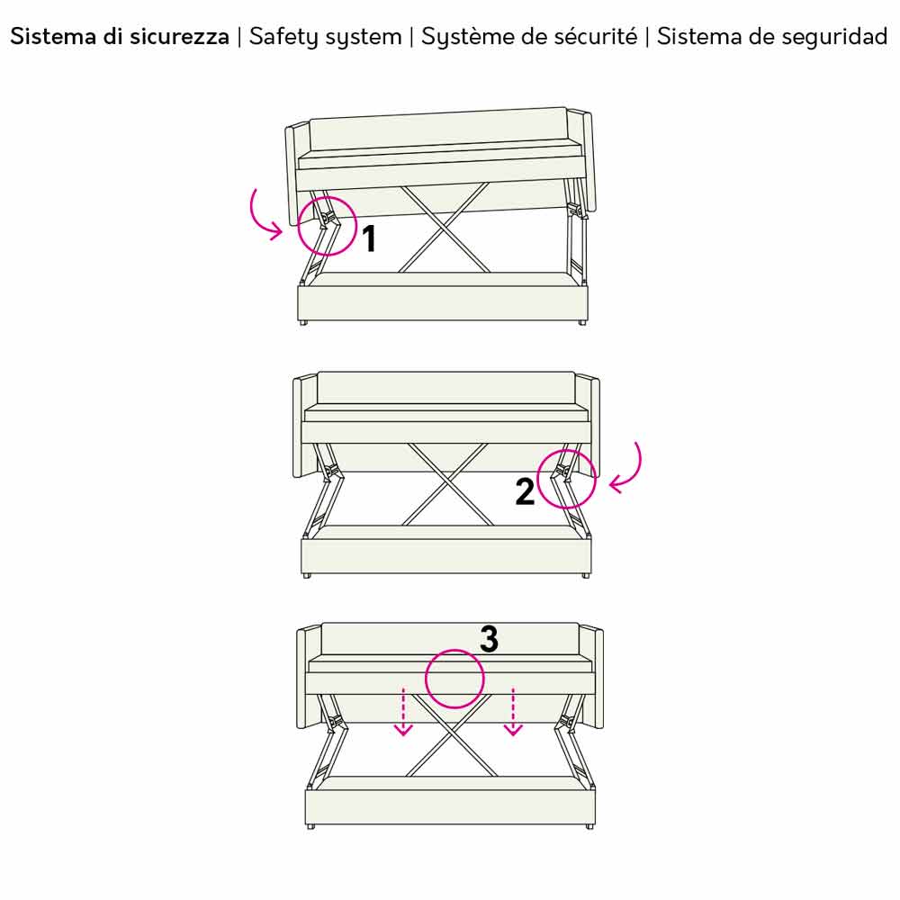 maximal komfort och lugn tack vare öppningssystemet med tre säkerhetsanordningar som förvandlar sängen till en soffa och vice versa och till nätverket som sticker ut med 30 cm för att underlätta och påskynda förberedelsen av den nedre sängen. För att stänga den igen räcker det med att frigöra de två sidostöden, som förblir blockerade tills mittstoppet också släpps. Bäddsoffan är också utrustad med en praktisk stege och sidostång för en ännu större säkerhetsgaranti.