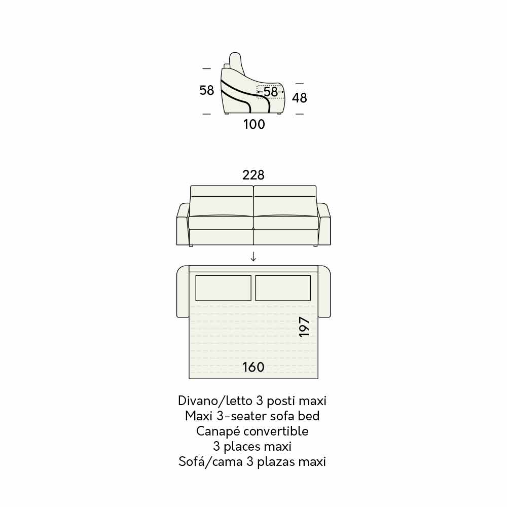 - L 228 x P 100 x H 104 cm (madrass: L 160 x P 197 x H 14 cm).