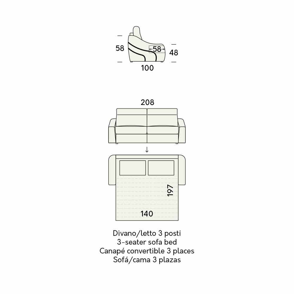 - L 208 x P 100 x H 104 cm (madrass: L 140 x P 197 x H 14 cm);