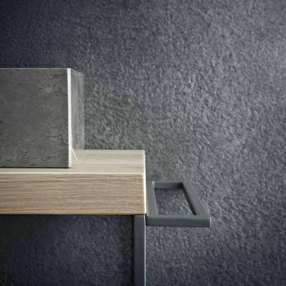 Kompositionen är i naturlig knuten ek , tvättställ i grå sten , metallkonstruktioner i matt mörkgrå lack. Väggenhet i matt mörkgrå lack.