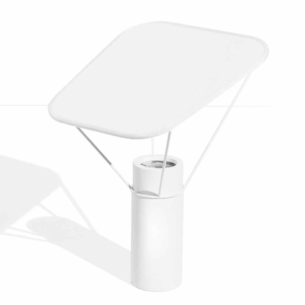 Denna moderna bordslampa har en struktur gjord av vitmålat harts med vit bomullslampa .