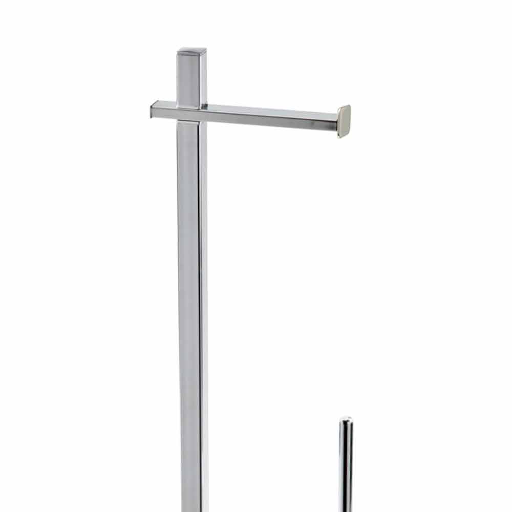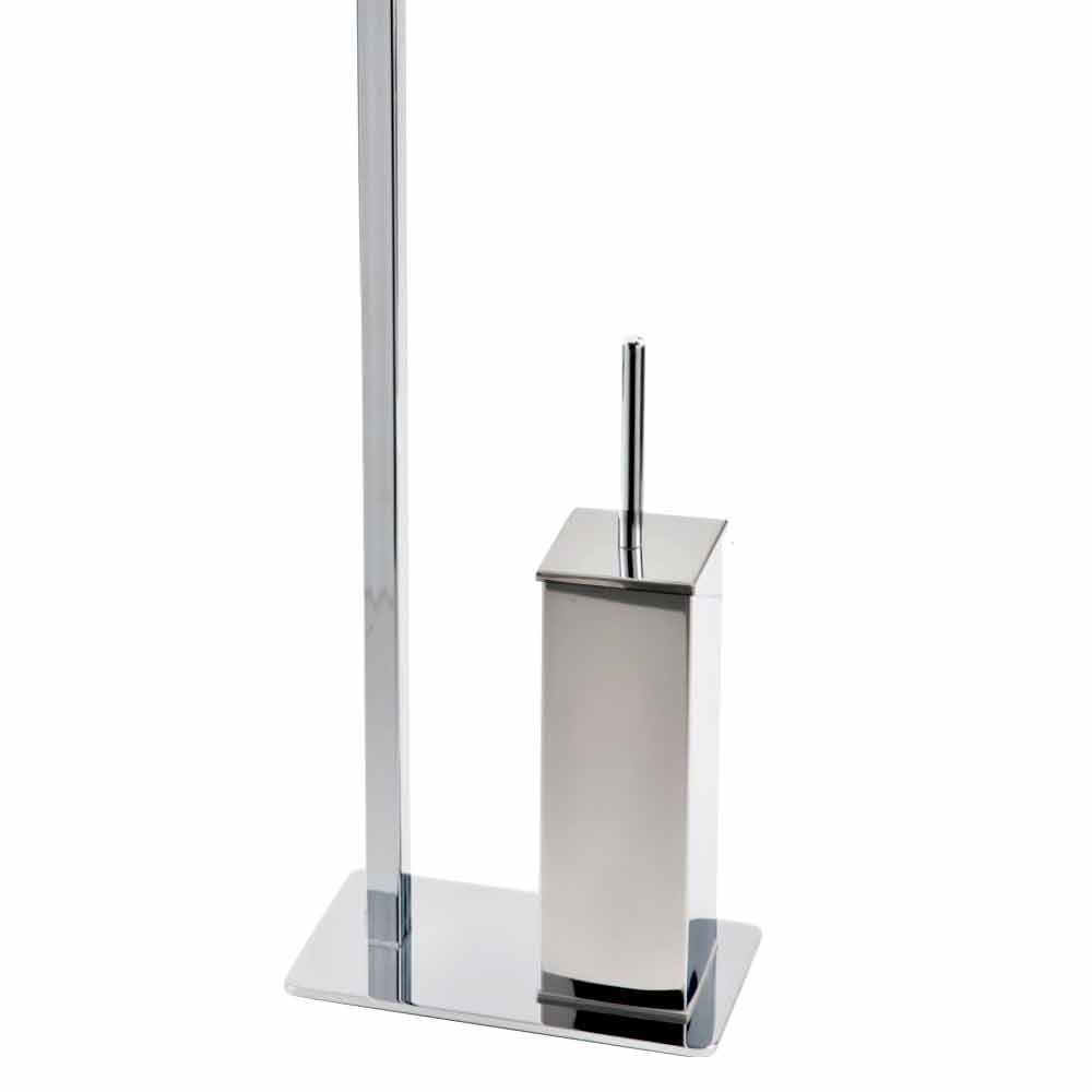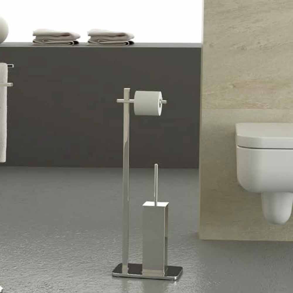 Golvstativ för rulle och toalettborste tillverkad i Italien med förkromad järnstruktur . Det som kännetecknas av mjuka och rundade linjer , det som gör detta inredningstillbehör med en raffinerad smak unik är dess omisskännliga enkelhet som understryker dess elegans och starka personlighet .
