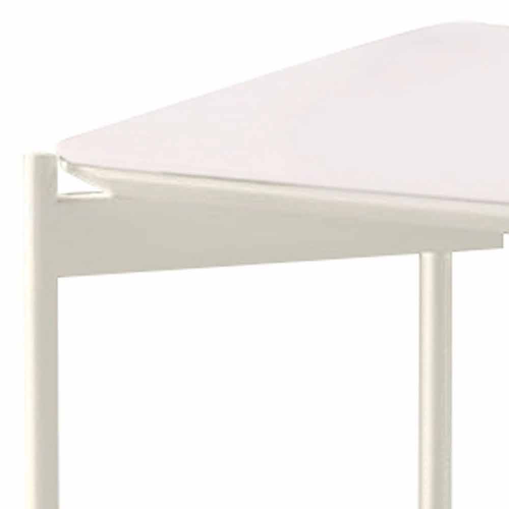 Lågt modernt soffbord med keramisk topp och metallstruktur.