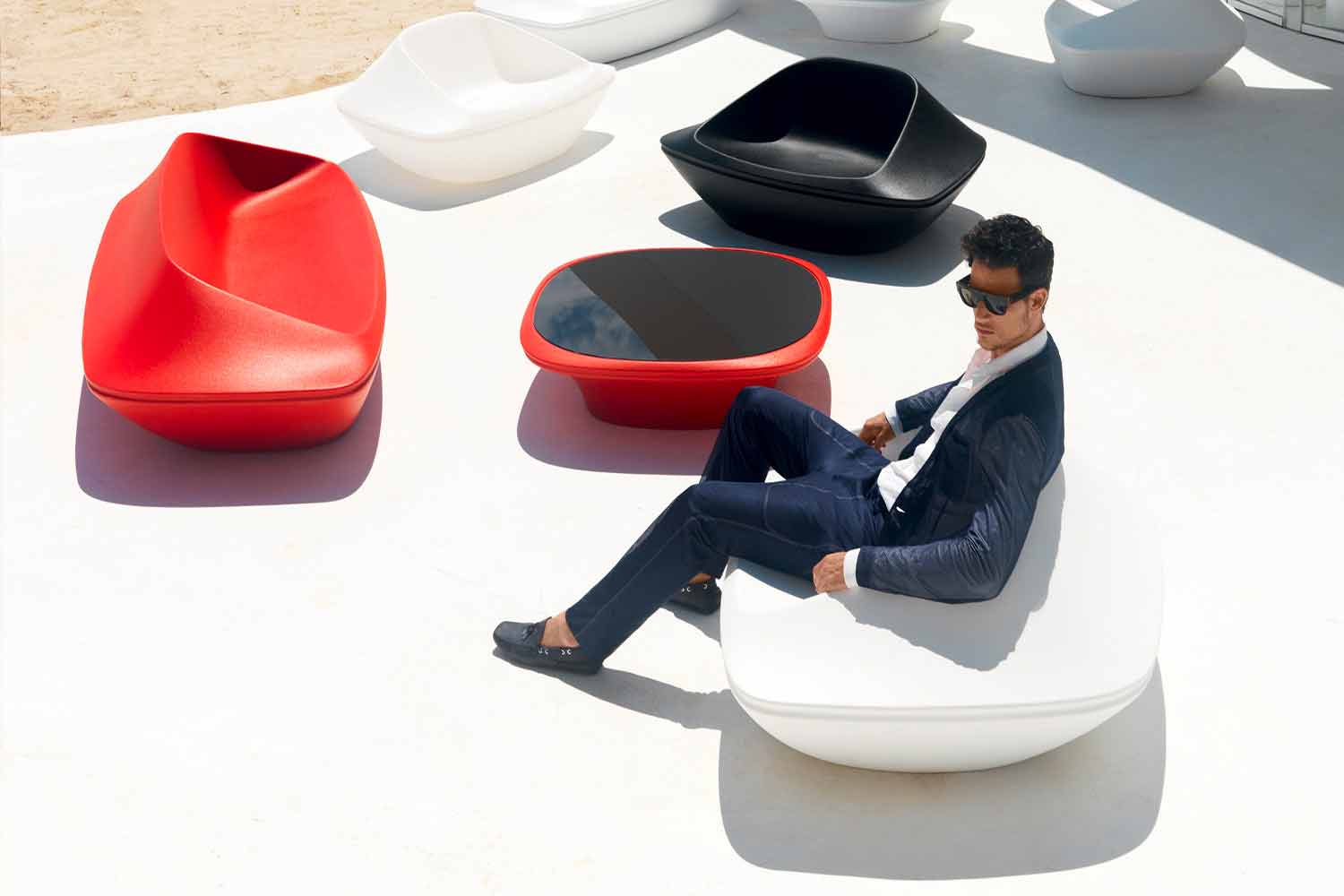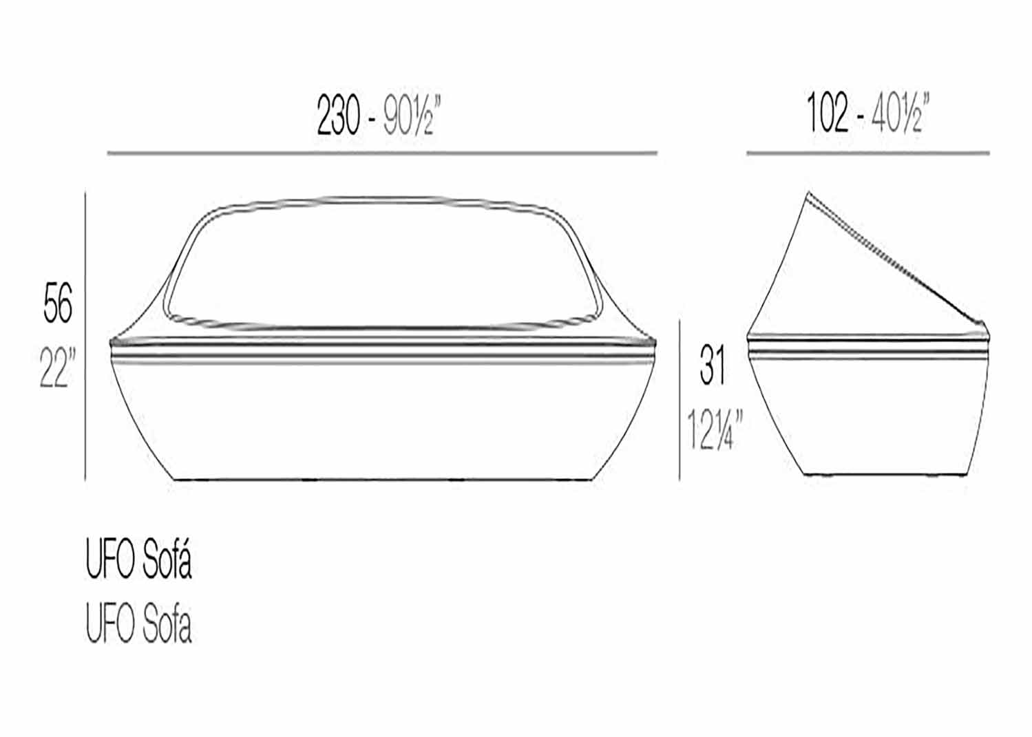 Ufo-samlingen kännetecknas av motsättningen av negativa och positiva former. Detta kreativa tillvägagångssätt har skapat en monolitisk, flytande och skulpturell linje. Hans artiklar gör det möjligt att skapa olika kombinationer som lätt kan anpassas till utomhusytor tack vare sina eleganta och resistenta material. Färgerna, sortimentet av ytbehandlingar och den interna belysningen ökar möjligheterna att skapa olika miljöer.