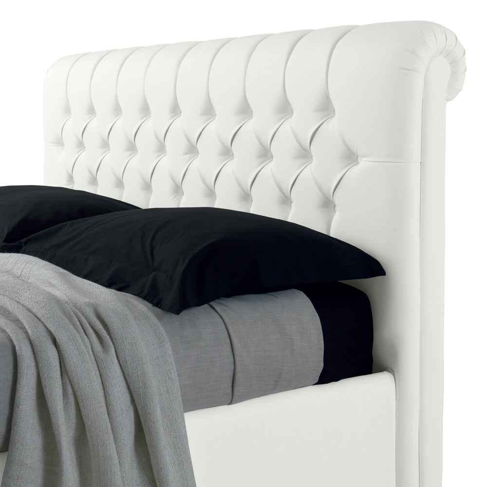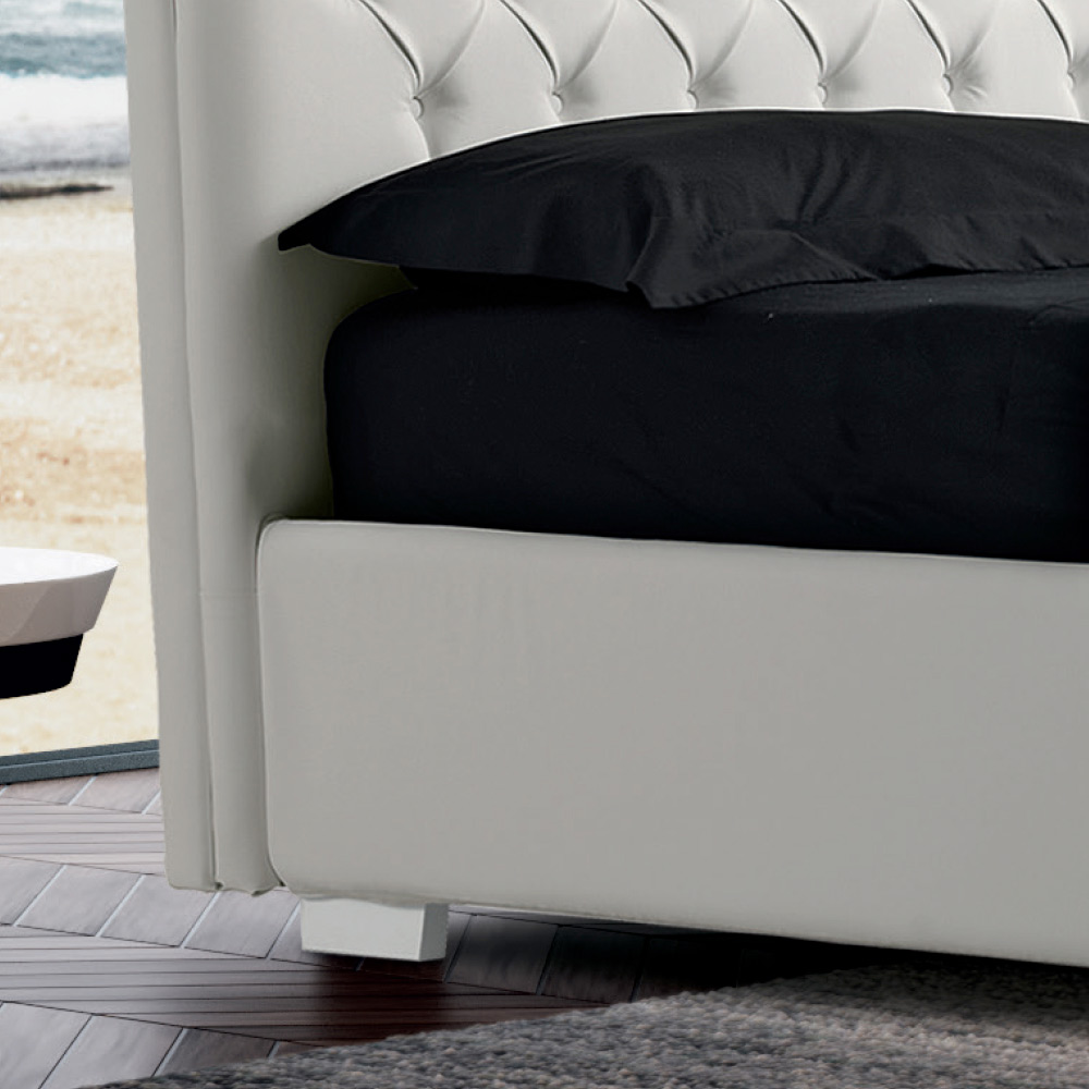 helt och hållet för hand av tapetserare och är en säng vars capitonnè-utförande förstärker den perfekta geometrin hos sänggavelns diamantformade design, dekorerad med knappar. Inuti en robust ram av poppelplywood med D30 icke-deformerbar polyuretanstoppning.