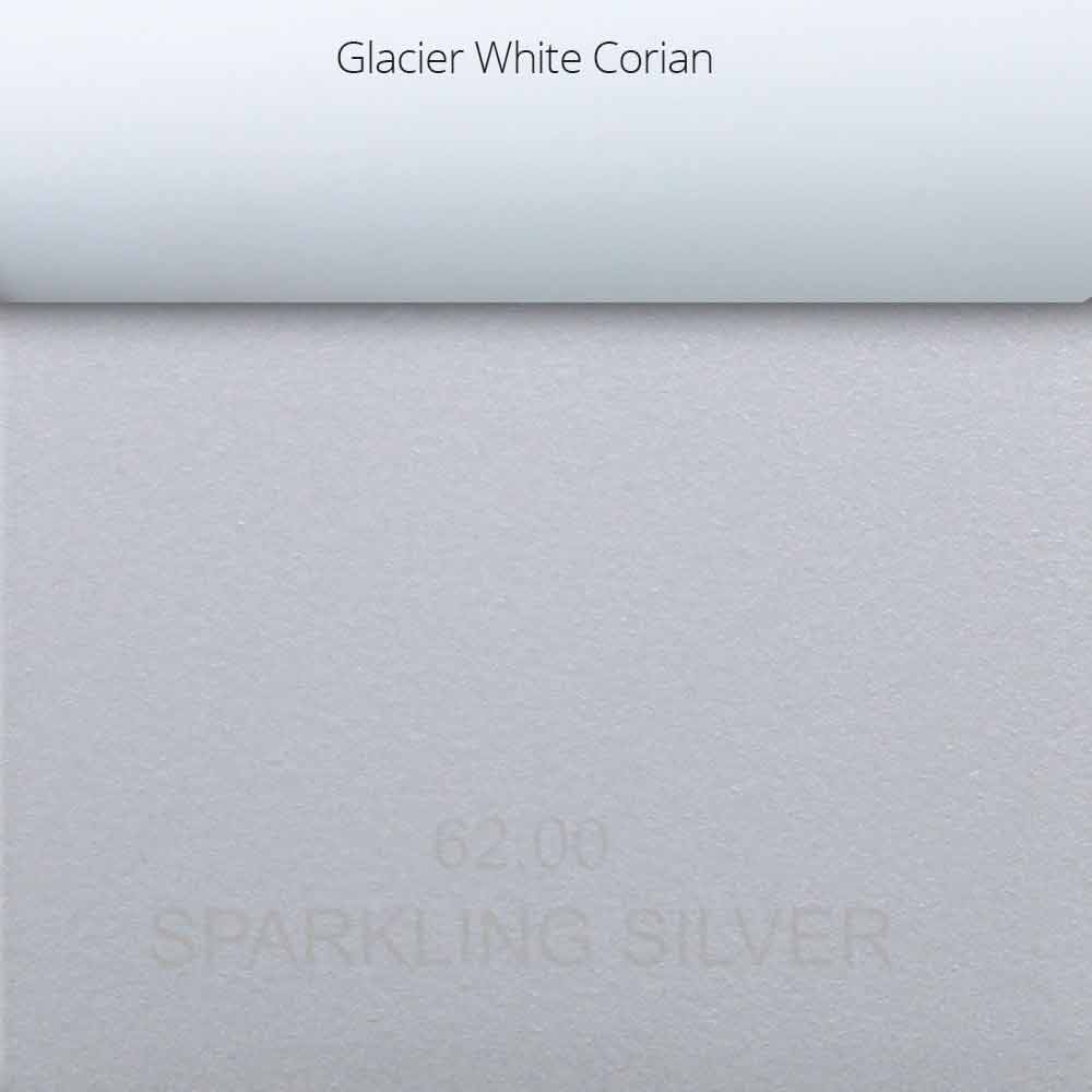 - Mousserande silver + glaciärvit Corian®: matt silvermetallisk yta med vita DuPont ™ Corian®-element;
