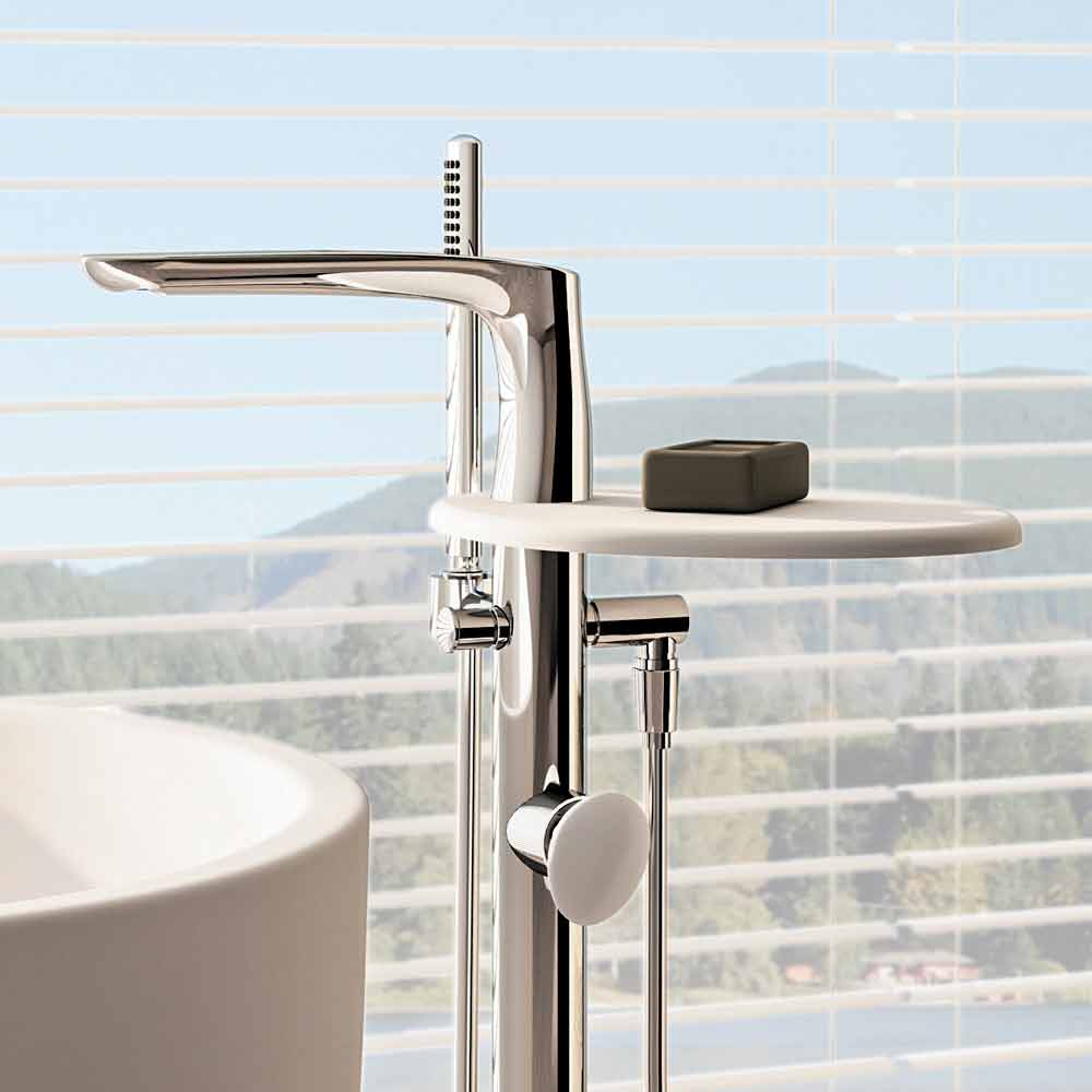 Däckmonterad badblandare med duplex handdusch, avledare och hylla i DuPont ™ Corian® Made in Italy.